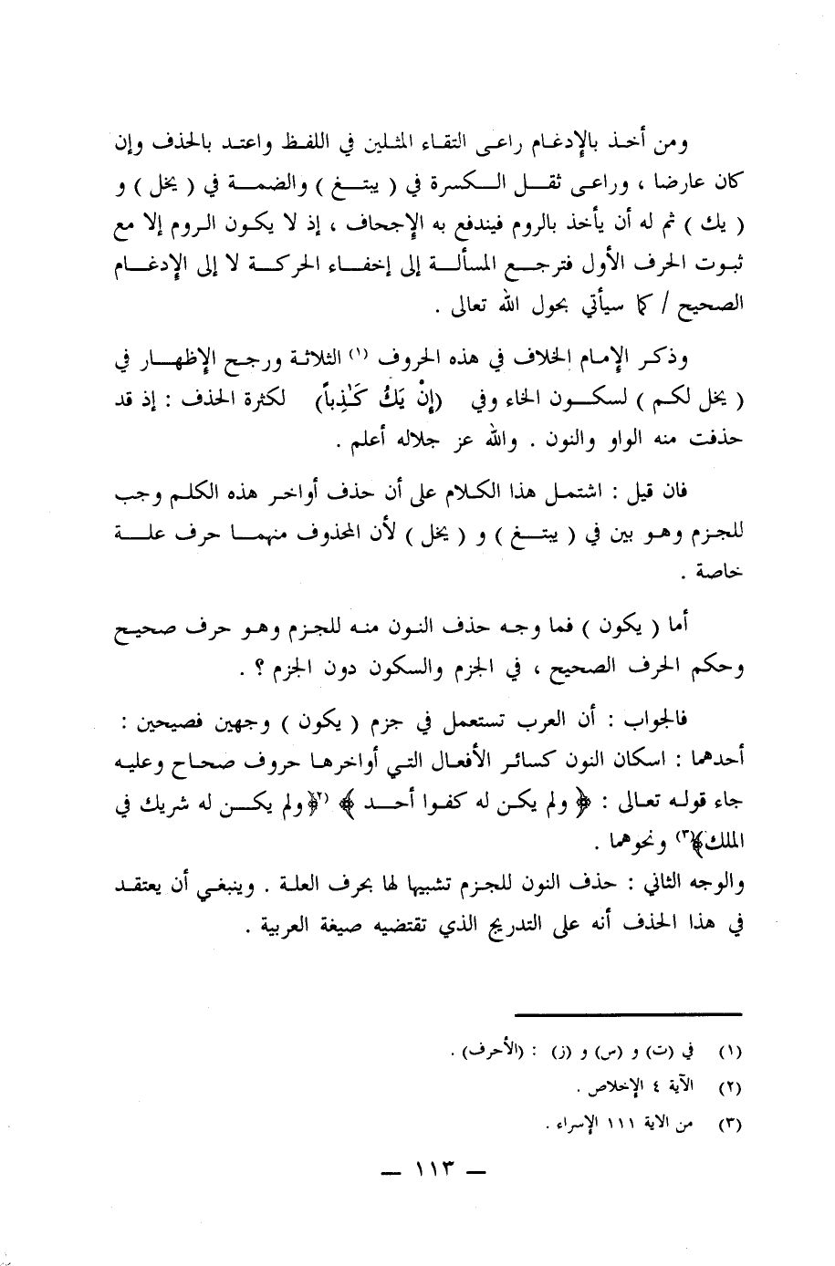 فالجواب: أن العرب تستعمل في جزم (يكون) وجهين فصيحين: أحدهما: اسكان النون كسائر الأفعال التي أواخرها حروف صحاح وعليه جاء قوله تعالى: {وَلَمْ يَكُنْ لَهُ كُفُوًا أَحَدٌ} (¬2) {وَلَمْ يَكُنْ لَهُ شَرِيكٌ فِي الْمُلْكِ} (¬3) ونحوهما.