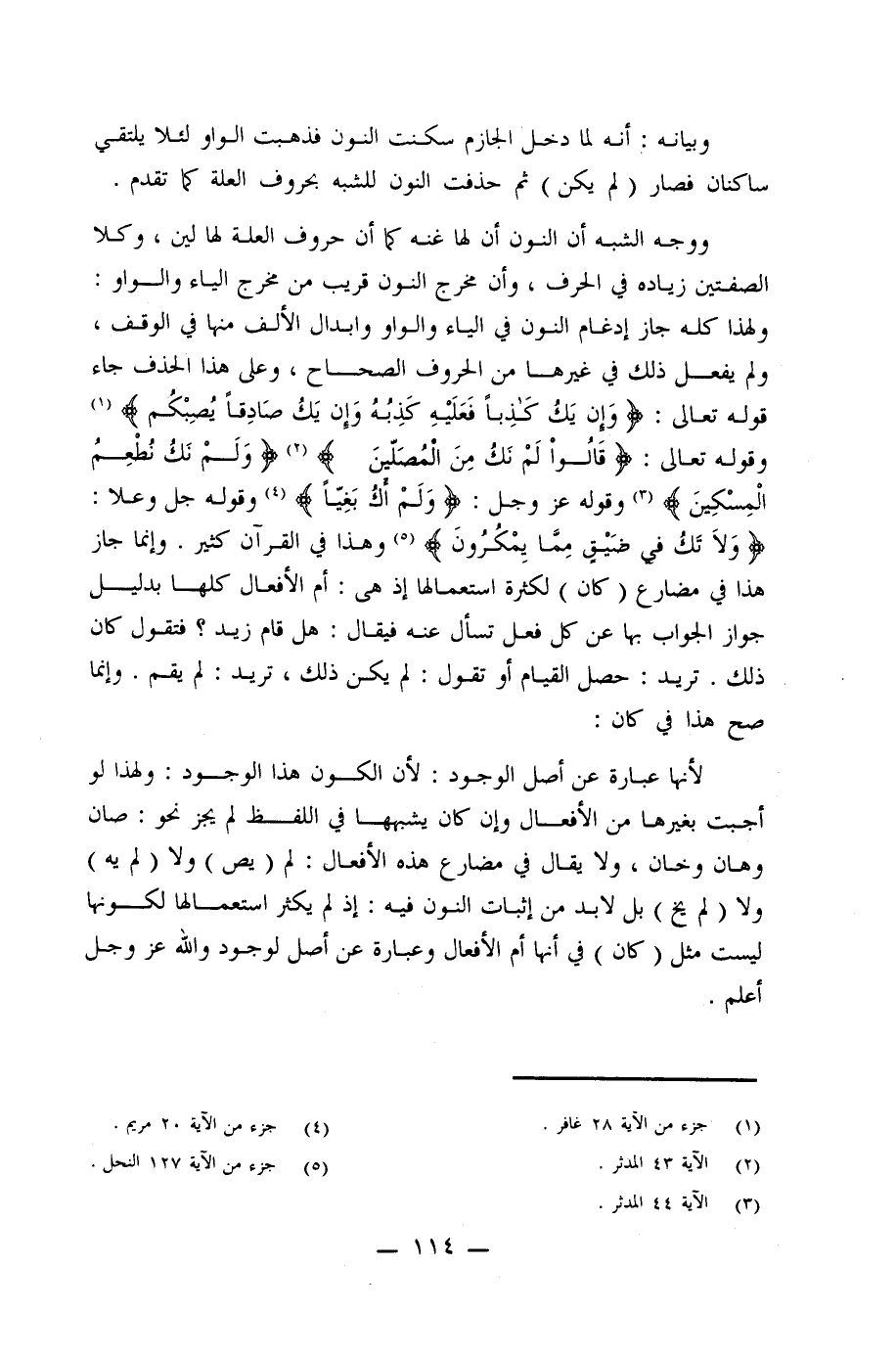 ووجه الشبه أن النون أن لها غنه؛ أن حروف العلة لها لين، وكلا الصفتين زياده في الحرف، وأن مخرج النون قريب من مخرج الياء والواو: ولهذا كله جاز إدغام النون في الياء والواو وإبدال الألف منها في الوقف، ولم يفعل ذلك في غيرها من الحروف الصحاح، وعلى هذا الحذف جاء قوله تعالى: {وَإِنْ يَكُ كَاذِبًا فَعَلَيْهِ كَذِبُهُ وَإِنْ يَكُ صَادِقًا يُصِبْكُمْ} (¬1) وقوله تعالى: {قَالُواْ لَمْ نَكُ مِنَ المُصَلِّينَ} (¬2) {وَلَمْ نَكُ نُطْعِمُ الْمِسْكِينَ} (¬3) وقوله - عَزَّ وَجَلَّ -: {وَلَمْ أَكُ بَغِيًّاْ (¬4) وقوله جل وعلا: {وَلَا تَكُ فِي ضَيْقٍ مِمَّا يِمْكُرُونَ} (¬5) وهذا في القرآن كثير. وإنما جاز هذا في مضارع (كان) لكثرة استعمالها إِذ هي: أم الأفعال كلها بدليل جواز الجواب بها عن كل فعل تسأل عنه فيقال: هل قام زيد؟ فتقول كان ذلك. تريد: حصل القيام أو تقول: لم يكن ذلك، تريد: لم يقم. وإنما صح هذا في كان: