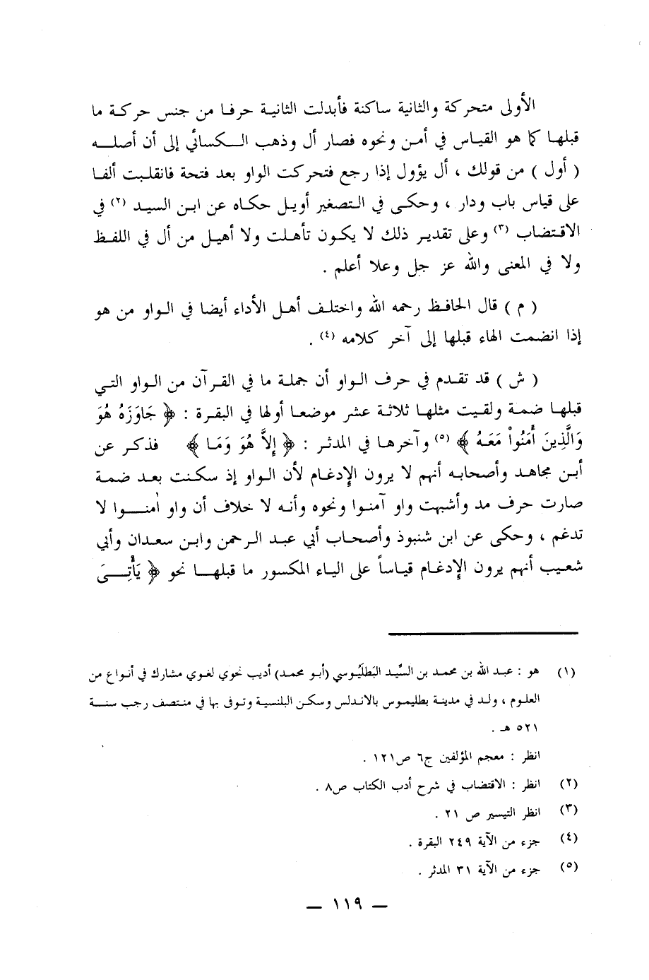 (¬1) هو: عبد الله بن محمد بن السيد البطلَيُوسي (أبو محمد) أديب نحوي لغوي مشارك في أنواع من العلوم، ولد في مدينة بطليموس بالأندلس وسكن البلنسية وتوفي بها في منتصف رجب سنة 521 هـ.