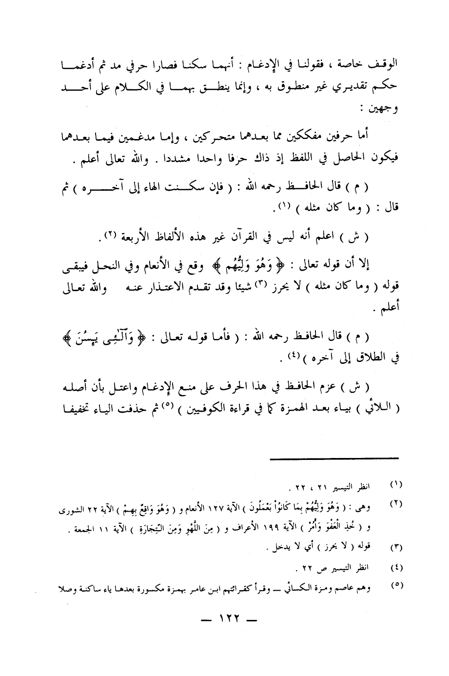 (ش) عزم الحافظ في هذا الحرف على منع الإِدغام واعتل بأن أصله (اللائي) بياء بعد الهمزة كما في قراءة الكوفيين) (¬5) ثم حذفت الياء تخفيفا