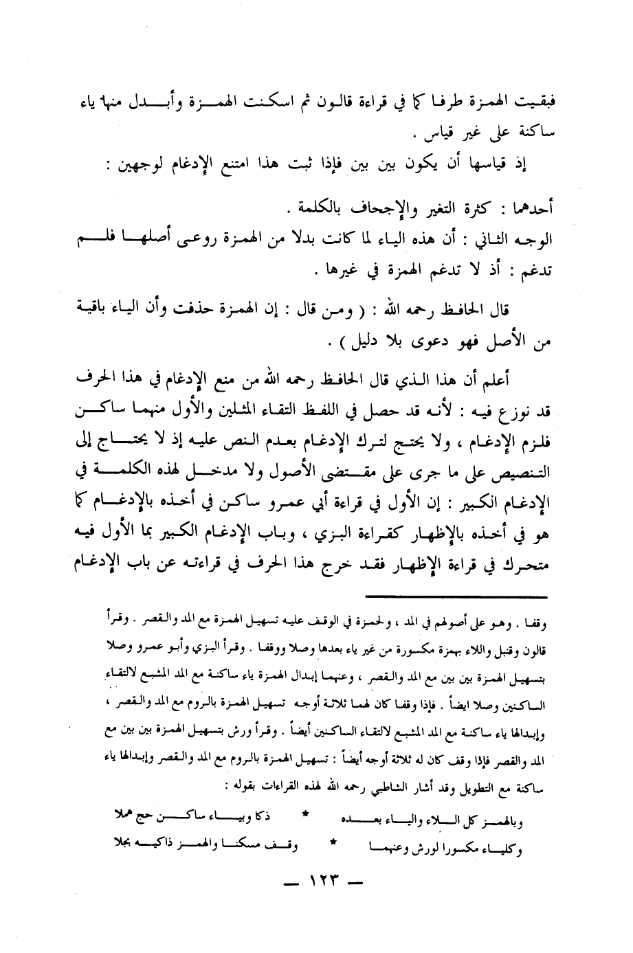 أعلم أن هذا الذي قال الحافظ - رَحِمَهُ اللهُ - من منع الإِدغام في هذا الحرف قد نوزع فيه: لأنه قد حصل في اللفظ التقاء المثلين والأول منهما ساكن فلزم الإِدغام، ولا يحتج لترك الإِدغام بعدم النص عليه إذ لا يحتاج إلى التنصيص على ما جرى على مقتضى الأصول ولا مدخل لهذه الكلمة في الإِدغام الكبير: إن الأول في قراءة أبي عمرو ساكن في أخذه بالإِدغام كما هو في أخذه بالإِظهار كقراءة البزي، وباب الإِدغام الكبير بما الأول فيه متحرك في قراءة الإِظهار فقد خرج هذا الحرف في قراءته عن باب الإِدغام