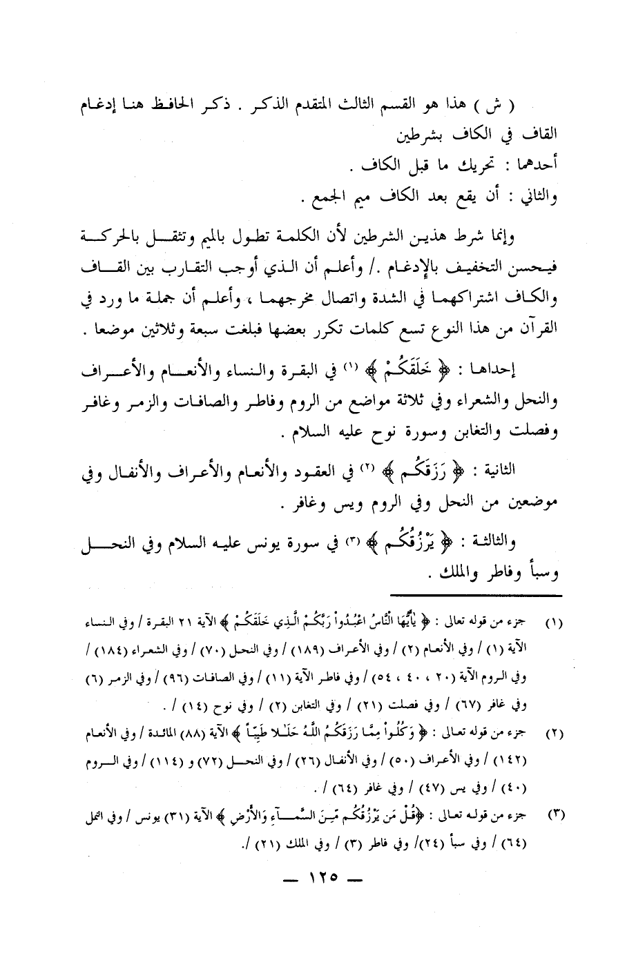 (ش) هذا هو القسم الثالث المتقدم الذكر. ذكر الحافظ هنا إدغام القاف في الكاف بشرطين
