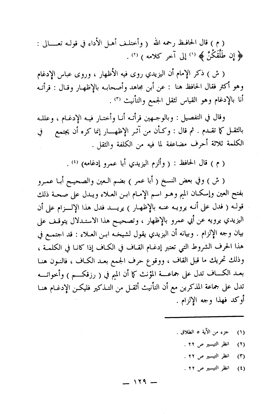 (ش) ذكر الإِمام أن اليزيدي روى فيه الأظهار، وروى عباس الإِدغام وهو أكثر فقال الحافظ هنا: عن ابن مجاهد وأصحابه بالإِظهار وقال: قرأته أنا بالإِدغام وهو القياس لثقل الجمع والتأنيث (¬3).