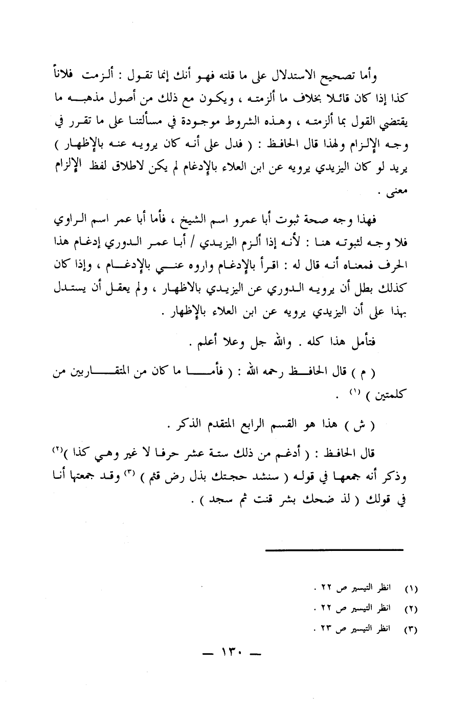 وأما تصحيح الإستدلال على ما قلته فهو أنك إنما تقول: ألزمت فلانًا كذا إذا كان قائلا بخلاف ما ألزمته، ويكون مع ذلك من أصول مذهبه ما يقتضي القول بما ألزمته، وهذه الشروط موجودة في مسألتنا على ما تقرر في وجه الإِلزام ولهذا قال الحافظ: (فدل على أنه كان يرويه عنه بالإِظهار) يريد لو كان اليزيدي يرويه عن ابن العلاء بالإِدغام لم يكن لاطلاق لفظ الإِلزام معنى.