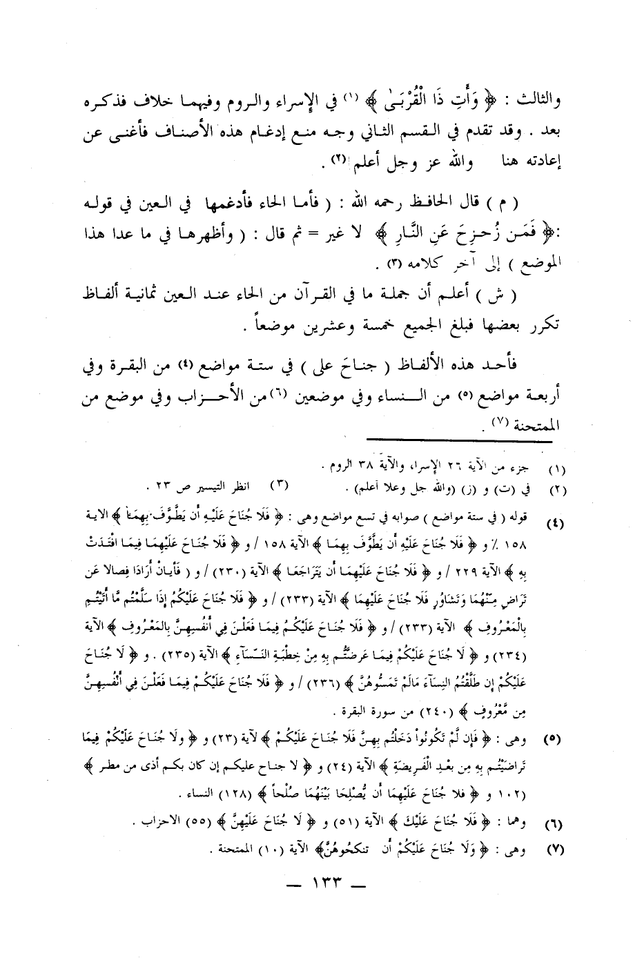 (¬4) قوله (في ستة مواضع) صوابه في تسع مواضع وهي: {فَلَا جُنَاحَ عَلَيْهِ أَنْ يَطَّوَّفَ بِهِمَا} الآية 158 / و {فَلَا جُنَاحَ عَلَيْهِ أَنْ يَطَّوَّفَ بِهِمَا} الآية 158 و {فَلَا جُنَاحَ عَلَيْهِمَا فِيمَا افْتَدَتْ بِهِ} الآية 229 /: {فَلَا جُنَاحَ عَلَيْهِمَا أَنْ يَتَرَاجَعَا} الآية (230) / و {فَإِنْ أَرَادَا فِصَالًا عَنْ تَرَاضٍ مِنْهُمَا وَتَشَاوُرٍ فَلَا جُنَاحَ عَلَيْهِمَا} الآية (233) / و {فَلَا جُنَاحَ عَلَيْكُمْ إِذَا سَلَّمْتُمْ مَا آتَيْتُمْ بِالْمَعْرُوفِ} الآية (233) / و {فَلَا جُنَاحَ عَلَيْكُمْ فِيمَا فَعَلْنَ فِي أَنْفُسِهِنَّ بِالْمَعْرُوفِ} الآية (234) و {لَا جُنَاحَ عَلَيْكُمْ فِيمَا عَرَّضْتُمْ بِهِ مِنْ خِطْبَةِ النِّسَاءِ} الآية (235). و {لَا جُنَاحَ عَلَيْكُمْ إِنْ طَلَّقْتُمُ النِّسَاءَ مَا لَمْ تَمَسُّوهُنَّ} (236) / و {فَلَا جُنَاحَ عَلَيْكُمْ فِي مَا فَعَلْنَ فِي أَنْفُسِهِنَّ مِنْ مَعْرُوفٍ} (240) من سورة البقرة.