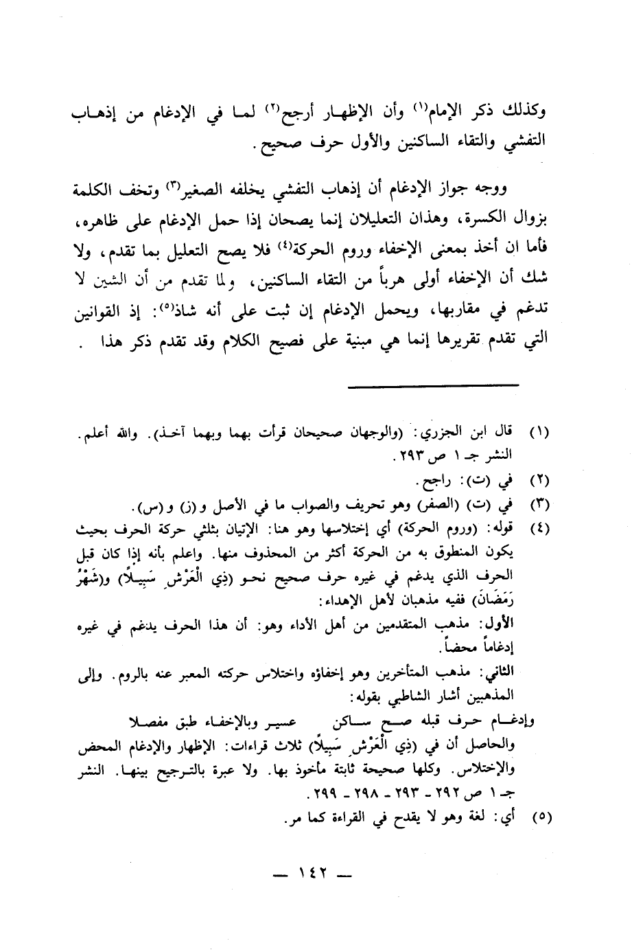 وكذلك ذكر الإِمام (¬1) وأن الإِظهار أرجح (¬2) لما في الإِدغام من إذهاب التفشي والتقاء الساكنين والأول حرف صحيح.