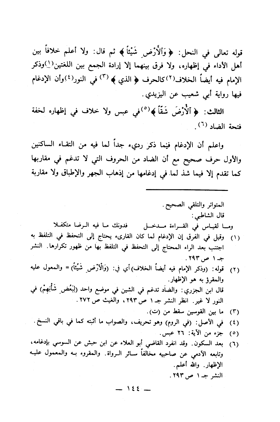 قوله تعالى في النحل: {وَالْأَرْضِ شَيْئًا} ثم قال: ولا أعلم خلافًا بين أهل الأداء في إظهاره، ولا فرق بينهما إلا إرادة الجمع بين اللغتين (¬1) وذكر الإِمام فيه أيضًا الخلاف (¬2) كالحرف {الَّذِي} (¬3) في النور (¬4) وأن الإِدغام فيها رواية أبي شعيب عن اليزيدي.