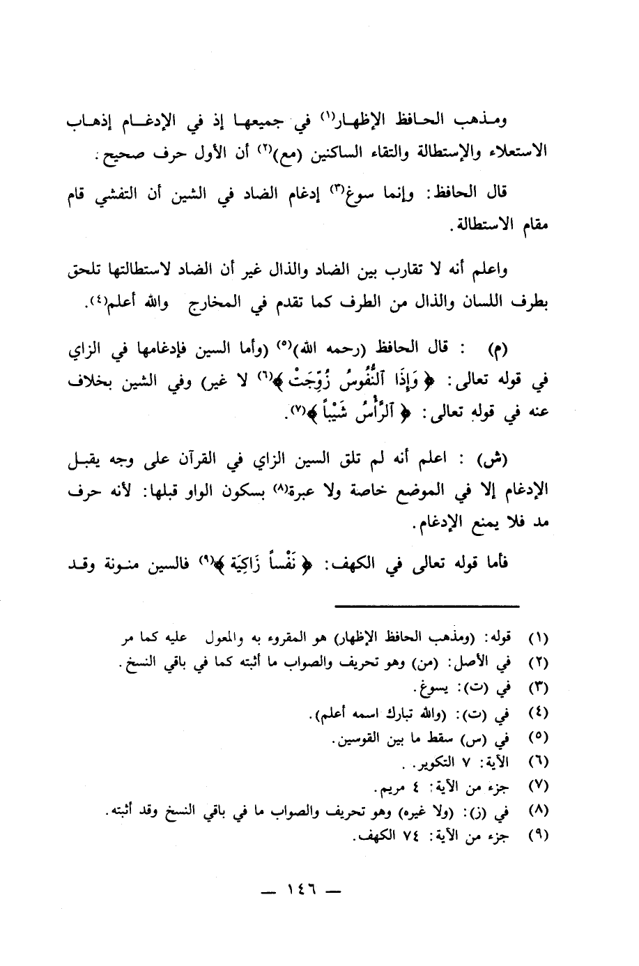 (م): قال الحافظ (- رَحِمَهُ اللهُ -) (¬5) (وأما السين فإدغامها في الزاي في قوله تعالى: {وَإِذَا النُّفُوسُ زُوِّجَتْ} (¬6) لا غير) وفي الشين بخلاف عنه في قوله تعالى: {الرَّأْسُ شَيْبًا} (¬7).
