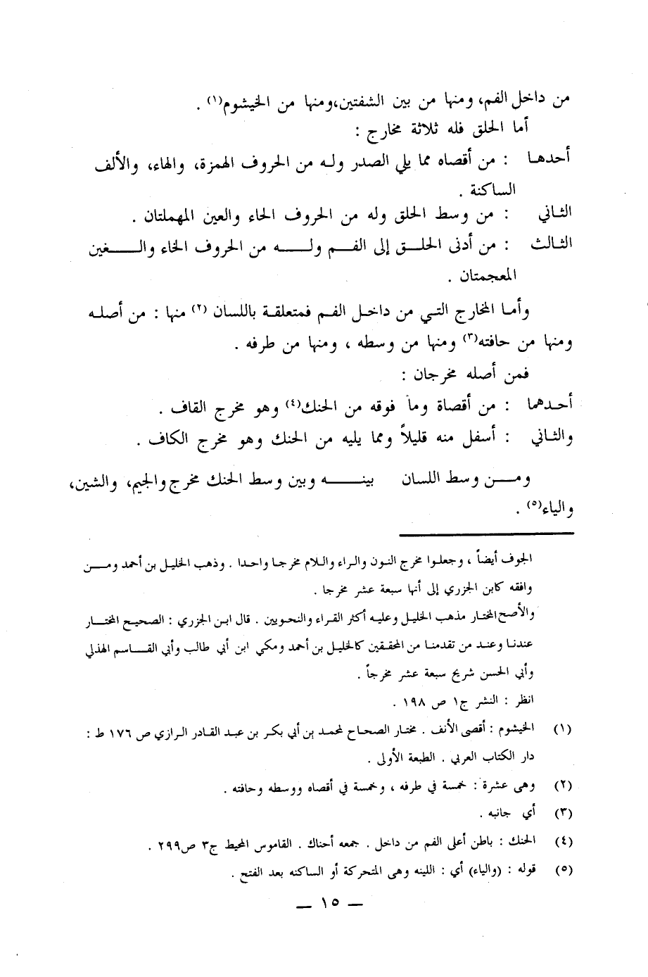 الجوف أيضاً، وجعلوا مخرج النون والراء واللام مخرجاً واحداً. وذهب الخليل بن أحمد ومن وافقه كإبن الجزري إلى أنها سبعة عشر مخرجاً.