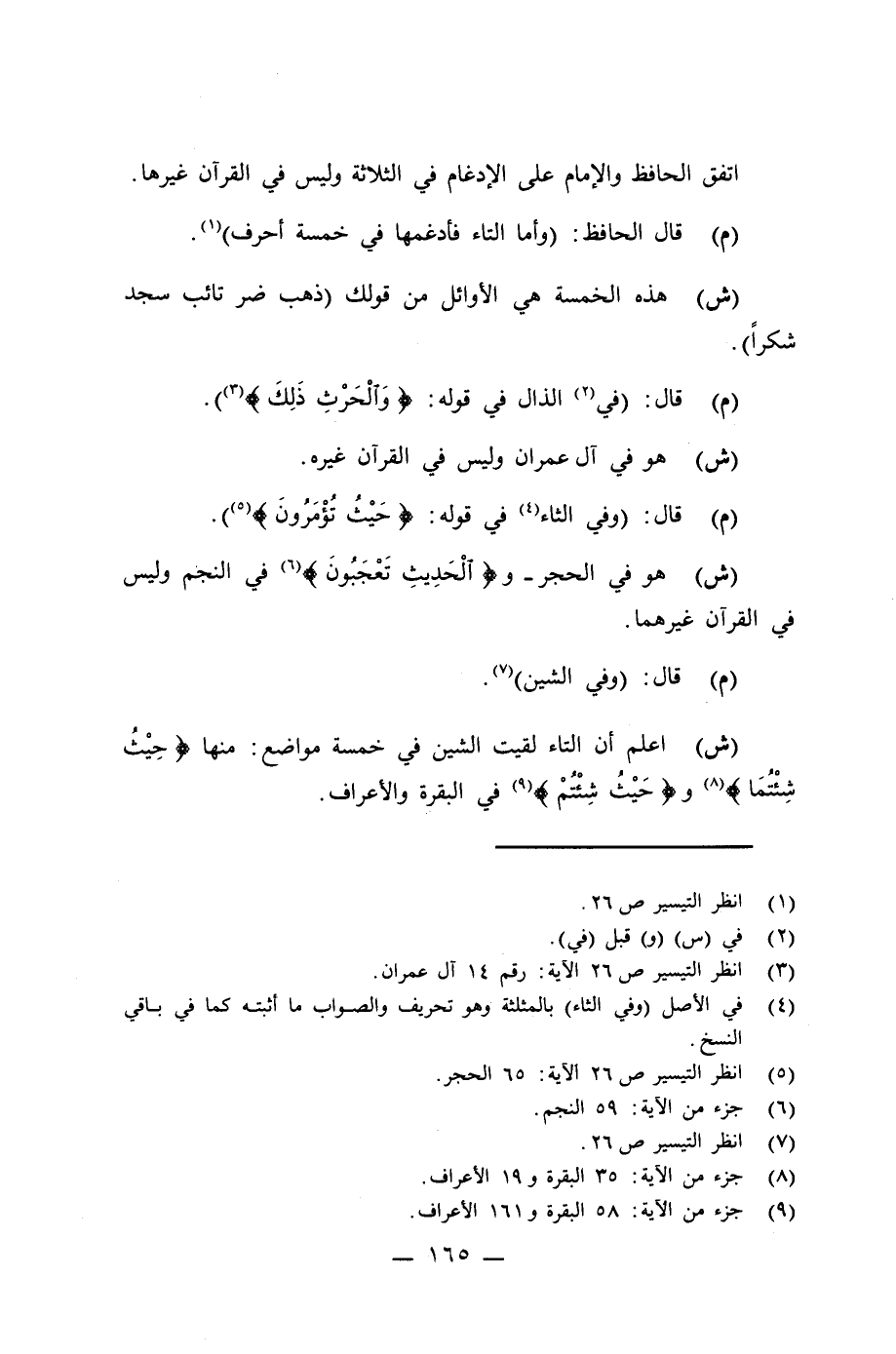 (ش) اعلم أن التاء لقيت الثين في خمسة مواضع: منها {حَيْثُ شِئْتُمَا} (¬8) و {حَيْثُ شِئْتُمْ} (¬9) في البقرة والأعراف.