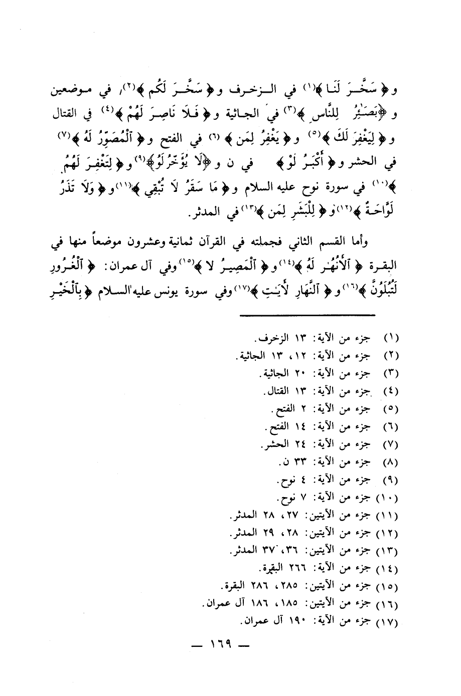 وأما القسم الثاني فجملته في القرآن ثمانية وعشرون موضعاً منها في البقرة {الْأَنْهَارُ لَهُ} (¬14) و {الْمَصِيرُ لا} (¬15) في آل عمران: {الْغُرُورِ (185) لَتُبْلَوُنَّ} (¬16) {النَّهَارِ لَآيَاتٍ} (¬17) وفي سورة يونس - عليه السلام - {بِالْخَيْرِ