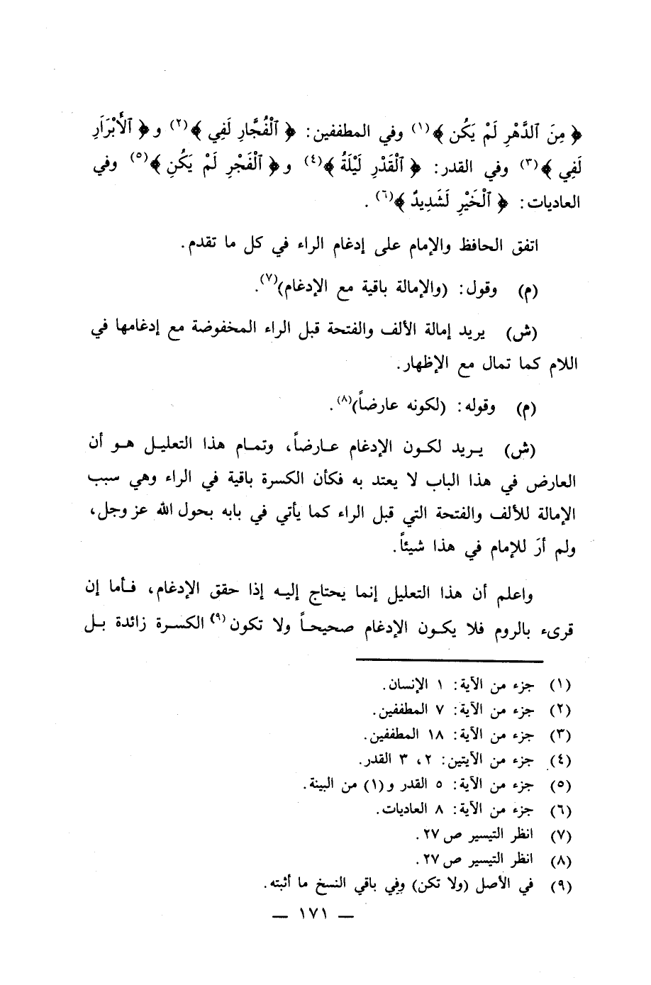 (ش) يريد إمالة الألف والفتحة قبل الراء المخفوضة مع إدغامها في اللام كما تمال مع الإِظهار.