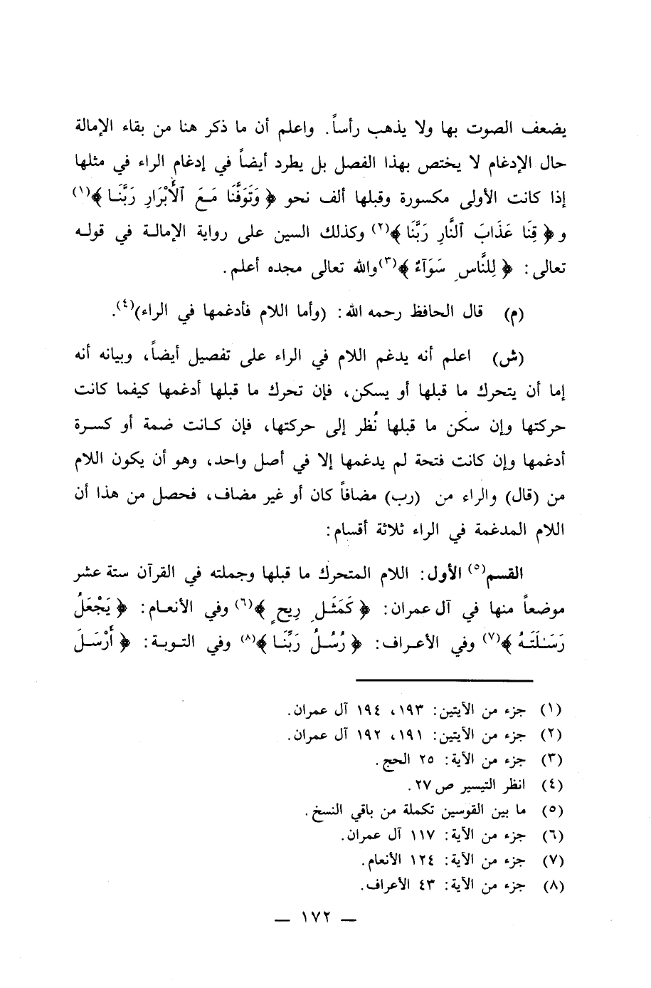 (ش) اعلم أنه يدغم اللام في الراء على تفصيل أيضاً، وبيانه أنه إما أن يتحرك ما قبلها أو يسكن، فإن تحرك ما قبلها أدغمها كيفما كانت حركتها وإن سكن ما قبلها نُظر إلى حركتها، فإن كانت ضمة أو كسرة أدغمها وإن كانت فتحة لم يدغمها إلا في أصل واحد، وهو أن يكون اللام من (قال) والراء من (رب) مضافاً كان أو غير مضاف، فحصل من هذا أن اللام المدغمة في الراء ثلاثة أقسام: