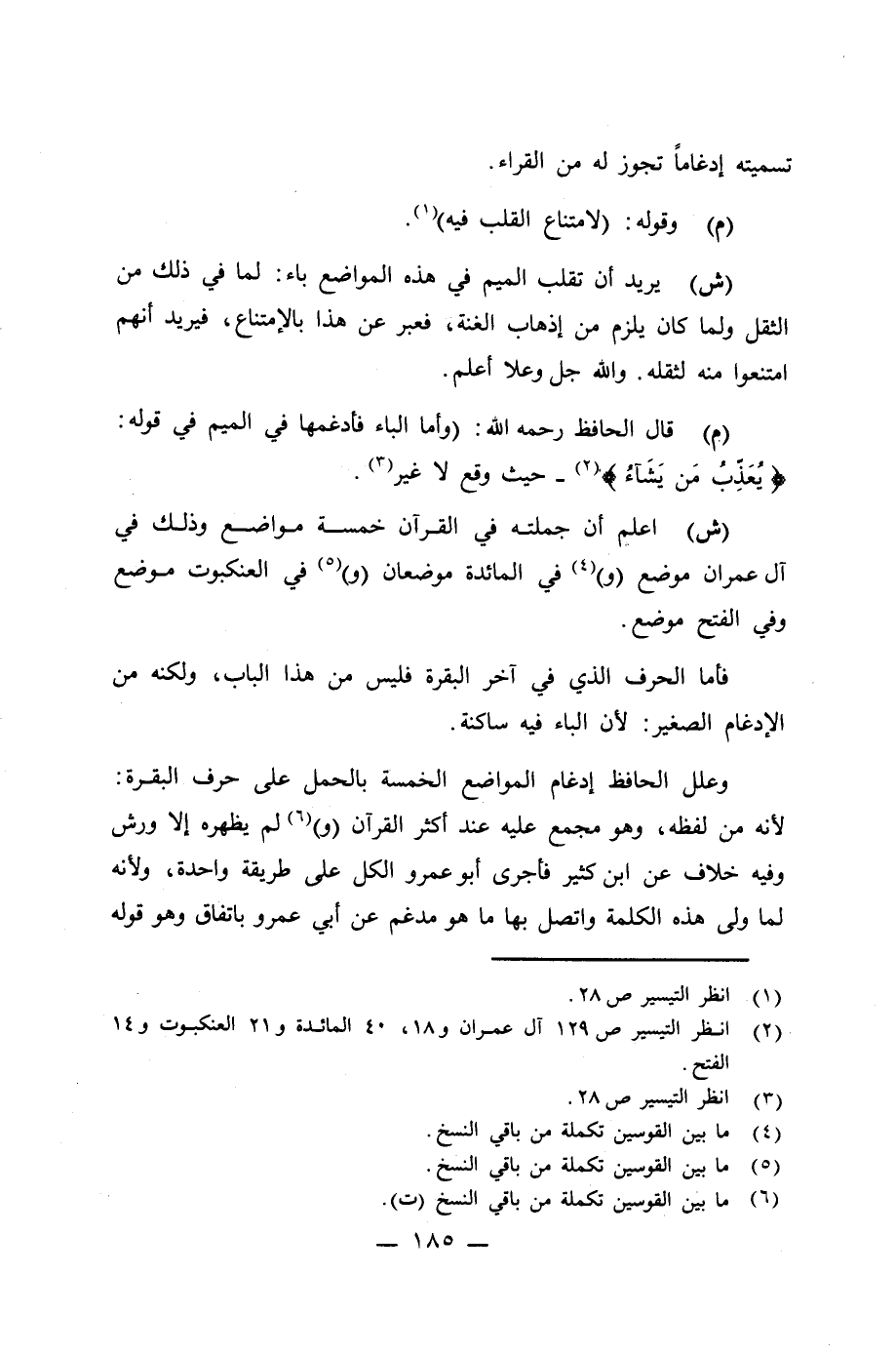 (م) قال الحافظ - رَحِمَهُ اللهُ -: (وأما الباء فادغمها في الميم في قوله: {يُعَذِّبُ مَنْ يَشَاءُ} (¬2) - حيث وقع لا غير (¬3).