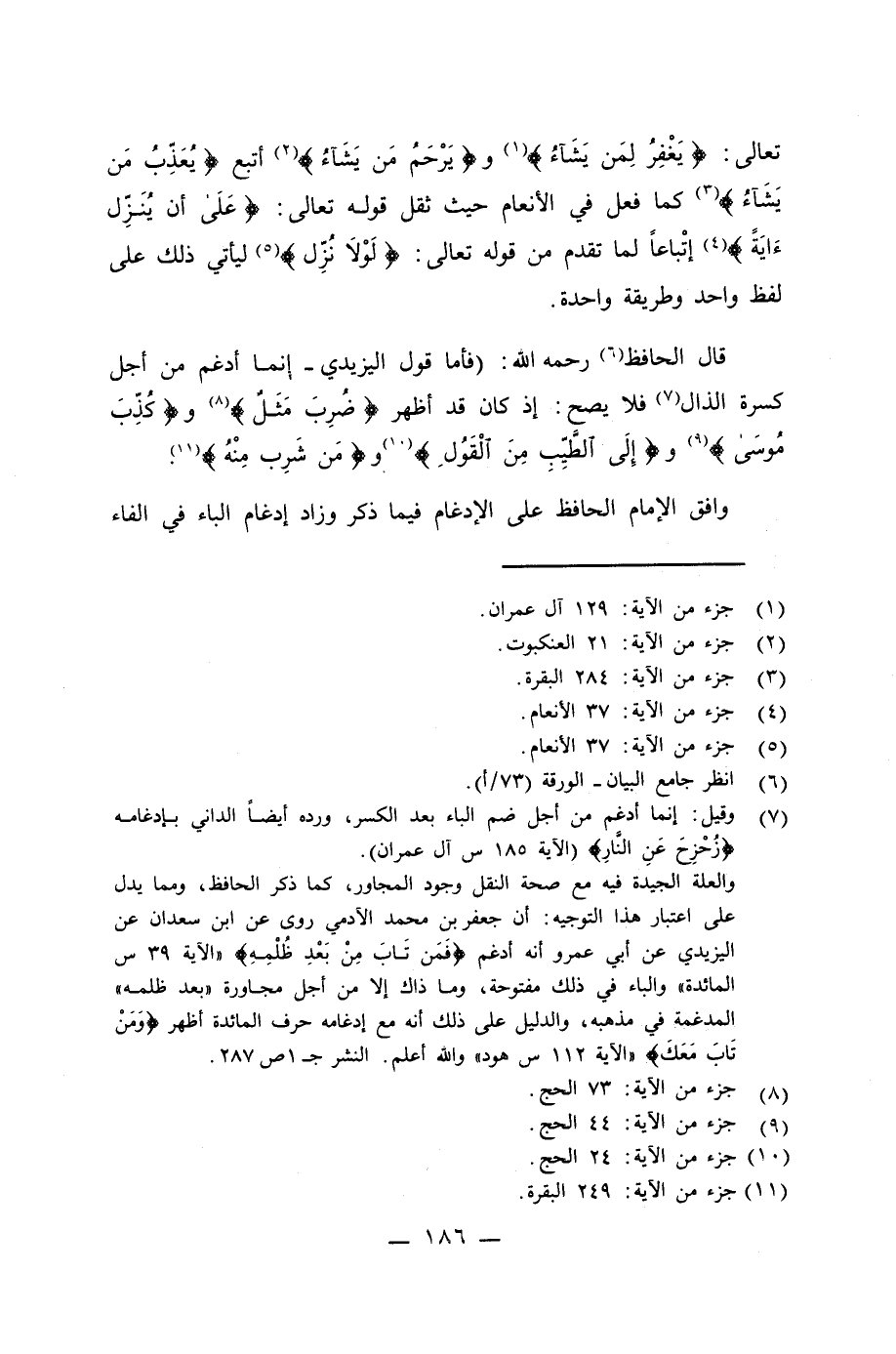 والعلة الجيدة فيه مع صحة النقل وجود المجاور، كما ذكر الحافظ، ومما يدل على اعتبار هذا التوجيه: أن جعفر بنِ محمد الآدمى روى عن ابن سعدان عن اليزيدي عن أبي عمرو أنه أدغم {فَمَنْ تَابَ مِنْ بَعْدِ ظُلْمِهِ} "الآية 39 س المائدة" والباء في ذلك مفتوحة، وما ذاك إلا من أجل مجاورة "بعد ظلمه" المدغمة في مذهبه، والدليل على ذلك أنه مع إدغامه حرف المائدة أظهر {وَمَنْ تَابَ مَعَكَ} "الآية 112 س هود" والله أعلم. النشر جـ 1 ص 287.