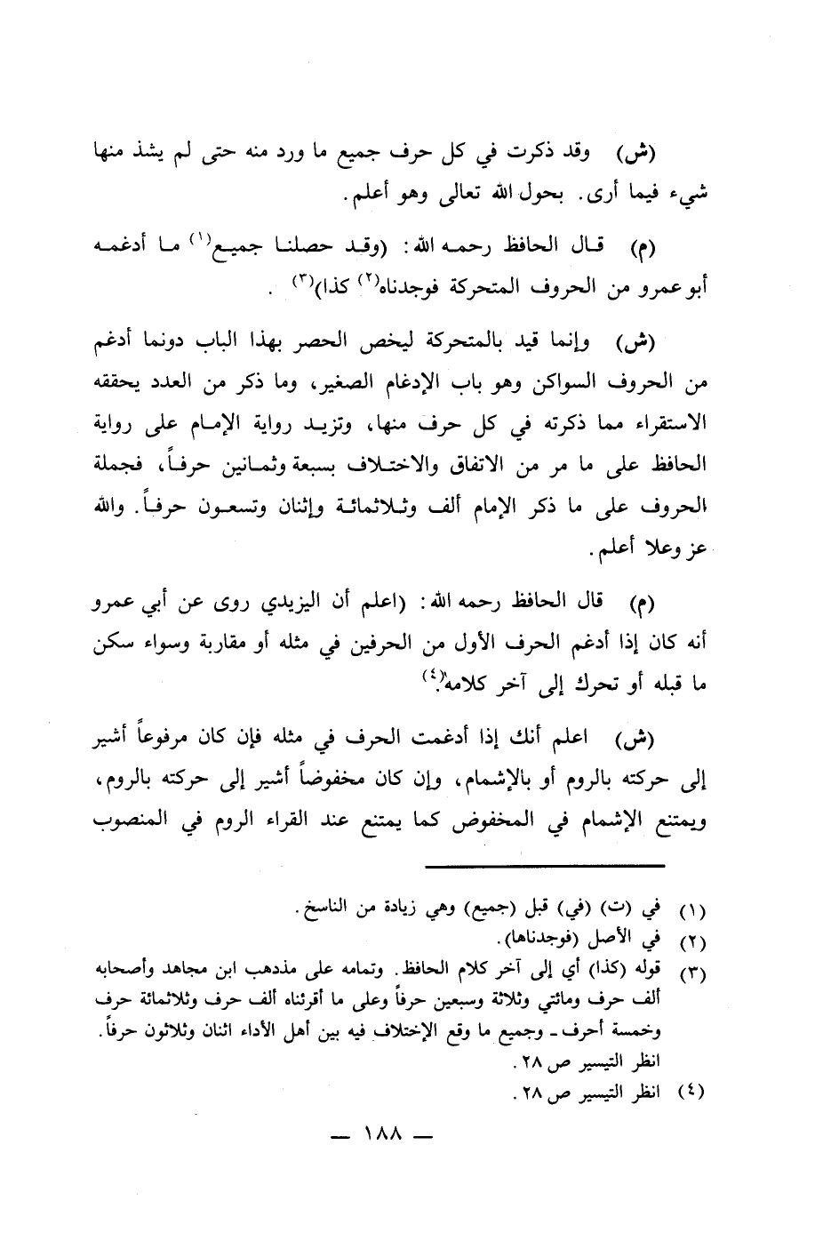 (ش) وإنما قيد بالمتحركة ليخص الحصر بهذا الباب دونما أدغم من الحروف السواكن وهو باب الإِدغام الصغير، وما ذكر من العدد يحققه الاستقراء مما ذكرته في كل حرف منها، وتزيد رواية الإِمام على رواية الحافظ على ما مر من الإتفاق والإختلاف بسبعة وثمانين حرفاً، فجملة الحروف على ما ذكر الإِمام ألف وثلاثمائة وإثنان وتسعون حرفاً. والله عز وعلا أعلم.