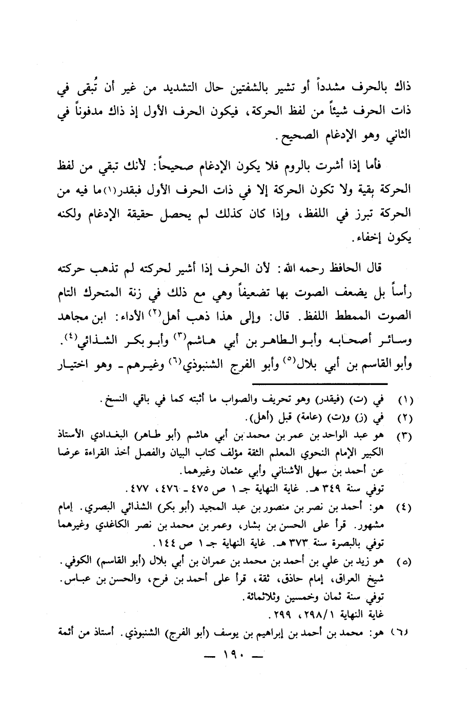 (¬4) هو: أحمد بن نصر بن منصوربن عبد المجيد (أبو بكر) الشذائي البصري. إمام مشهور. قرأ على الحسن بن بشار، وعمر بن محمد بن نصر الكاغدي وغيرهما توفي بالبصرة سنة 373 هـ. غاية النهاية جـ 1 ص 144.