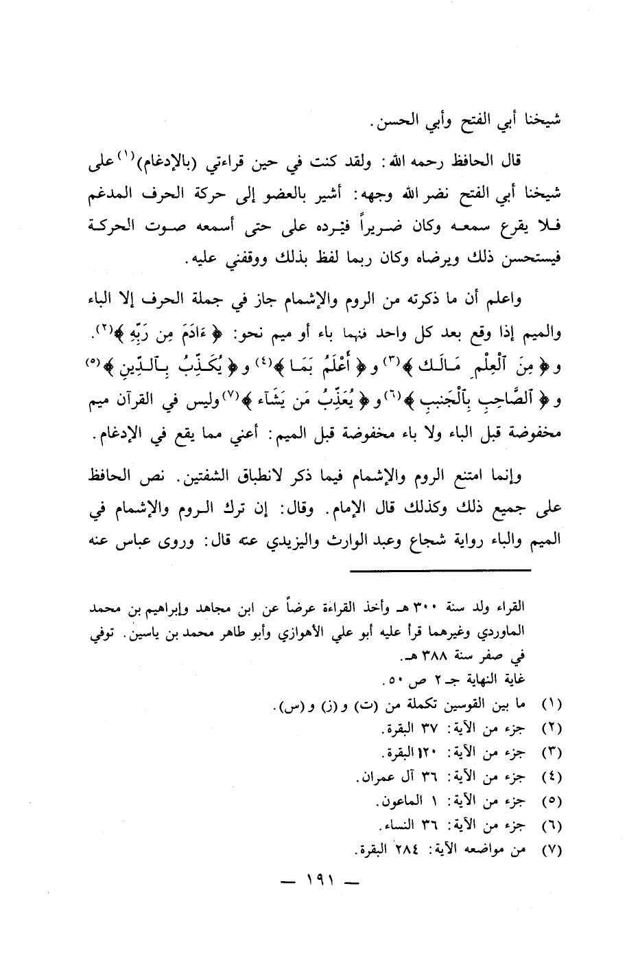 قال الحافظ - رَحِمَهُ اللهُ -: ولقد كنت في حين قراءتي (بالإِدغام) (¬1) على شيخنا أبي الفتح نضر الله وجهه: أشير بالعضو إلى حركة الحرف المدغم فلا يقرع سمعه وكان ضريراً فيرده على حتى أسمعه صوت الحركة فيستحسن ذلك ويرضاه وكان ربما لفظ بذلك ووقفني عليه.