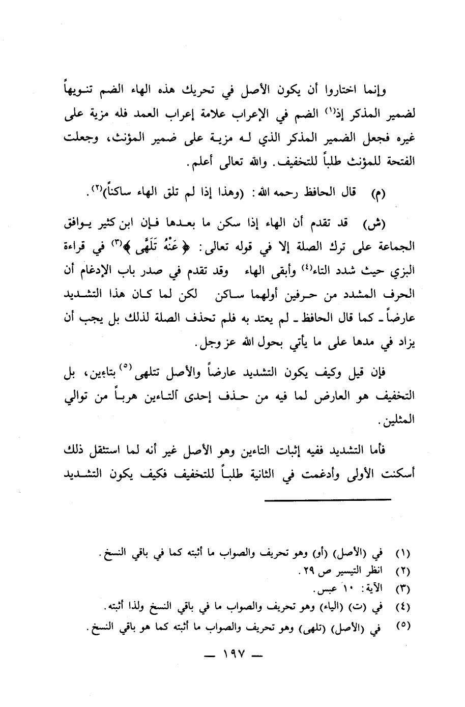 فإن قيل وكيف يكون التشديد عارضاً والأصل تتلهى (¬5) بتاءين، بل التخفيف هو العارض لما فيه من حذف إحدى التاءين هرباً من توالي المثلين.