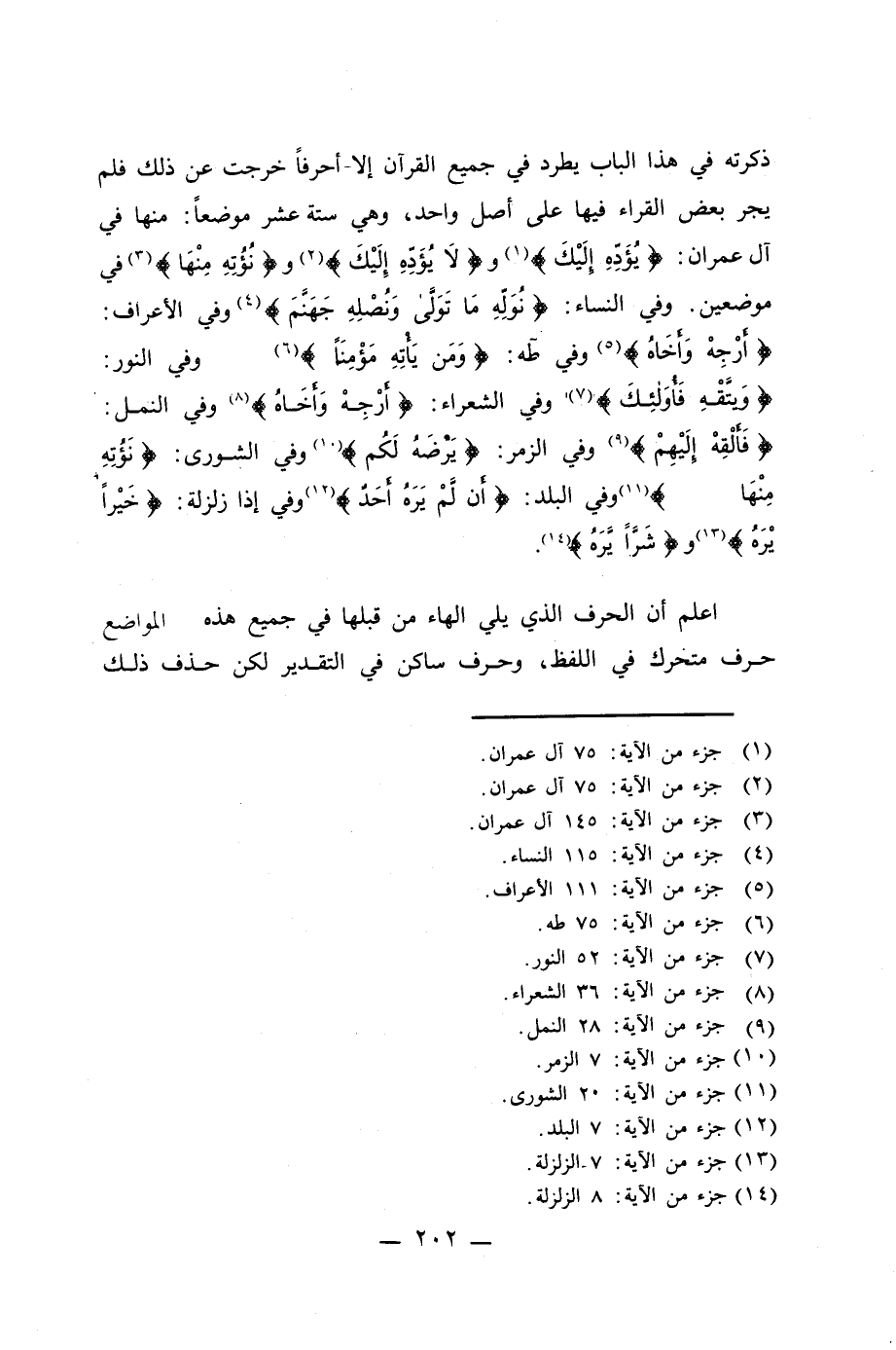 ذكرته في هذا الباب يطرد في جميع القرآن إلا - أحرفاً خرجت عن ذلك فلم يجر بعض القراء فيها على أصل واحد، وهي ستة عشر موضعاً: منها في آل عمران: {يُؤَدِّهِ إِلَيْكَ} (¬1) و {لَا يُؤَدِّهِ إِلَيْكَ} (¬2) و {نُؤْتِهِ مِنْهَا} (¬3) في موضعين. وفي النساء: {نُوَلِّهِ مَا تَوَلَّى وَنُصْلِهِ جَهَنَّمَ} (¬4) وفي الأعراف: {أَرْجِهْ وَأَخَاهُ} (¬5) وفي طه: {وَمَنْ يَأْتِهِ مُؤْمِنًا} (¬6) وفي النور: {وَيَتَّقْهِ فَأُولَئِكَ} (¬7) وفي الشعراء: {أَرْجِهْ وَأَخَاهُ} (¬8) وفي النمل: {فَأَلْقِهْ إِلَيْهِمْ} (¬9) وفي الزمر: {يَرْضَهُ لَكُمْ} (¬10) وفي الشورى: {نُؤْتِهِ مِنْهَا} (¬11) وفي البلد: {أَنْ لَمْ يَرَهُ أَحَدٌ} (¬12) وفي إذا زلزلة: {خَيْرًا يَرَهُ} (¬13) و {شَرًّا يَرَهُ} (¬14).