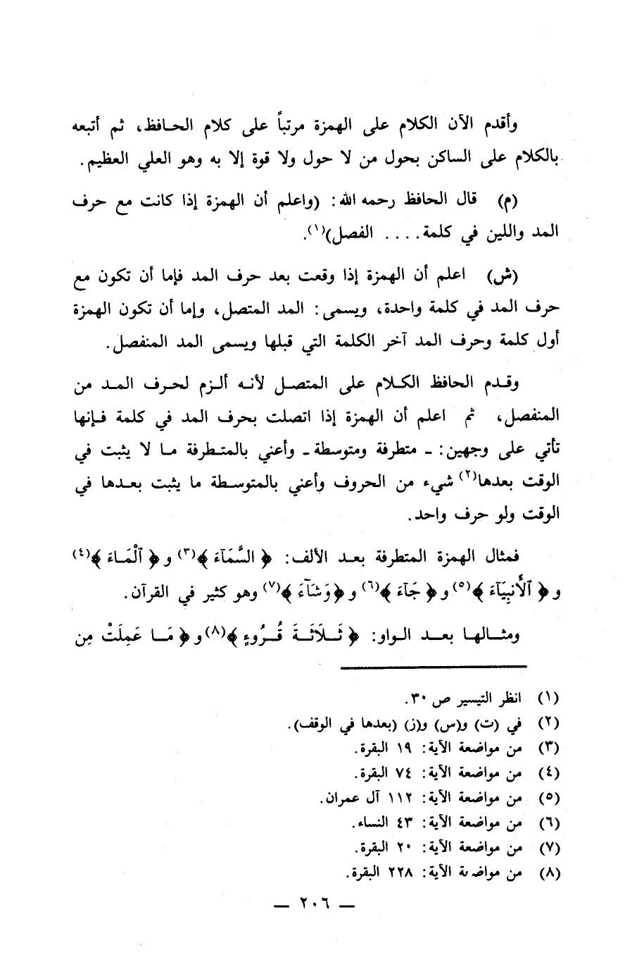 فمثال الهمزة المتطرفة بعد الألف: {السَّمَاءِ} (¬3) و {الْمَاءِ} (¬4) و {الْأَنْبِيَاءَ} (¬5) و {جَاءَ} (¬6) و {وَشَاءَ} (¬7) وهو كثير في القرآن.
