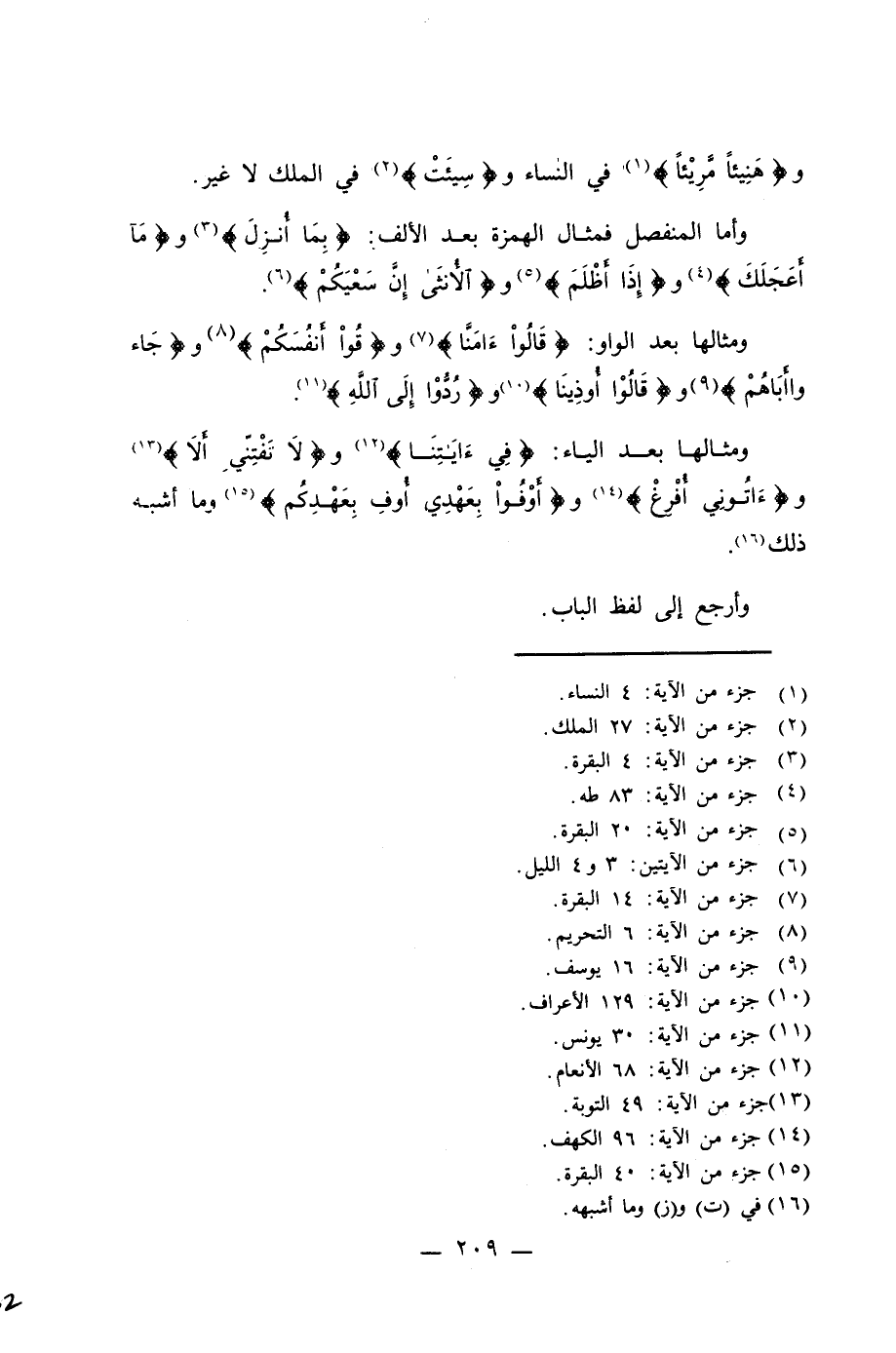 وأما المنفصل فمثال الهمزة بعد الألف: {بِمَا أُنْزِلَ} (¬3) و {مَا أَعْجَلَكَ} (¬4) و {إِذَا أَظْلَمَ} (¬5) و {الْأُنْثَى إِنَّ سَعْيَكُمْ} (¬6).