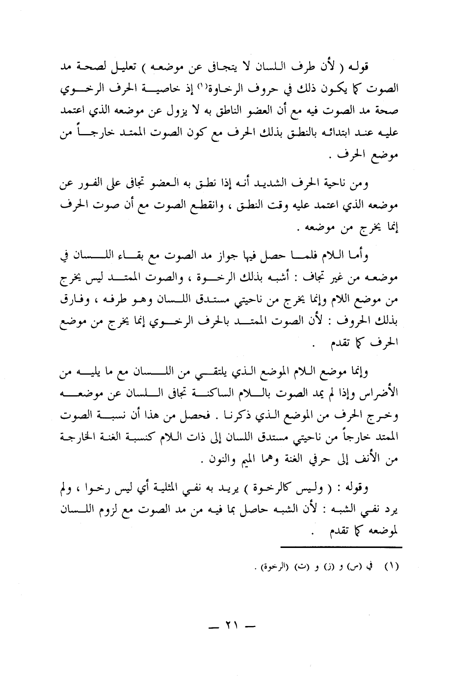قوله (لأن طرف اللسان لا يتجافى عن موضعه) تعليل لصحة مد الصوت كما يكون ذلك في حروف الرخاوة (¬1) إذ خاصية الحرف الرخوي صحة مد الصوت فيه مع أن العضو الناطق به لا يزول عن موضعه الذي اعتمد عليه عند ابتدائه بالنطق بذلك الحرف مع كون الصوت الممتد خارجاً من موضع الحرف.