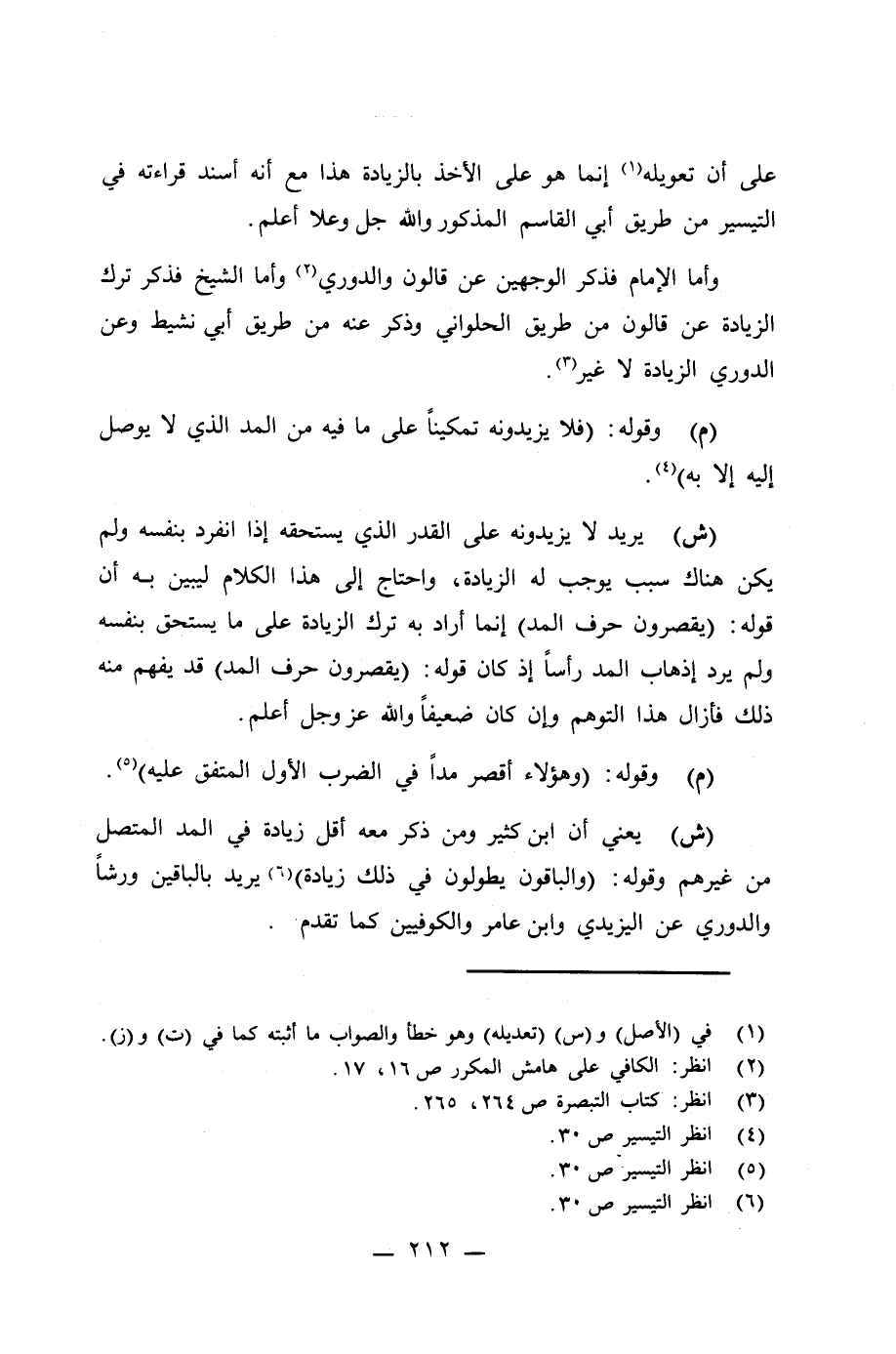 (ش) يريد لا يزيدونه على القدر الذي يستحقه إذا انفرد بنفسه ولم يكن هناك سبب يوجب له الزيادة، واحتاج إلى هذا الكلام ليبين به أن قوله: (يقصرون حرف المد) إنما أراد به ترك الزيادة على ما يستحق بنفسه ولم يرد إذهاب المد رأساً إذ كان قوله: (يقصرون حرف المد) قد يفهم منه ذلك فأزال هذا التوهم وإن كان ضعيفاً والله - عَزَّ وَجَلَّ - أعلم.
