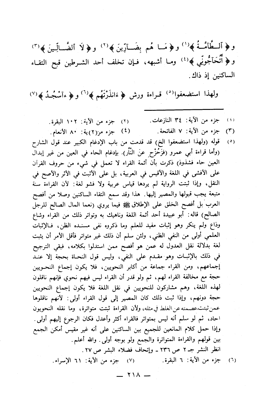 (¬5) قوله (ولهذا استضعفوا الخ) قد قدمت من باب الإِدغام الكبير عند قول الشارح (وأما قراءة أبي عمرو (فزَحزْحِ عنَ النْاَّر) ء بإدغام الحاء في العين من غير إبدال العين جاء فشذوذ) ذكرت بأن أئمة القراء لا تعمل في شيء من حروف القرآن على الأفشى في اللغة والأقيس في العربية، بل على الأثبت في الأثر والأصح في النقل، وإذا ثبتت الرواية لم يردها قياس عربية ولا فشو لغة: لأن القراءة سنة متبعة يجب قبولها والمصير إليها. هذا وقد سمع التقاء الساكنين وصلا من أفصح العرب بل أفصح الخلق على الإطلاق - صلى الله عليه وسلم - فيما يروي (نعما المال الصالح للرجل الصالح) قاله: أبو عبيدة أحد أئمة اللغة وناهيك به وتواتر ذلك من القراء وشاع وذاع ولم ينكر وهو إثبات مفيد للعلم وما ذكروه نفى مسنده الظن، فالإثبات العلمي أولى من النفي الظني، ولئن سلم أن ذلك غير متواتر فأقل الأمر أن يثبت لغة بدلالة نقل العدول له عمن هو أفصح ممن استدلوا بكلامه، فبقي الترجيح في ذلك بالإثبات وهو مقدم على النفي، وليس قول النحاة بحجة إلا عند إجماعهم، ومن القراء جماعة من أكابر النحويين، فلا يكون إجماع النحويين حجة مع مخالفة القراء لهم، ثم ولو قدر أن القراء ليس فيهم نحوي فإنهم ناقلون لهذه اللغة، وهم مشاركون للنحويين في نقل اللغة فلا يكون إجماع النحويين حجة دونهم، وإذا ثبت ذلك كان المصير إلى قول القراء أولى: لأنهم ناقلوها عمن ثبتت. عصمته عن الغلط في مثله، ولأن القراءة ثبتت متواترة، وما نقله النحويون احاد، ثم لو سلم أنه ليس بمتواتر فالقراء أكثر وأعدل فكان الرجوع إليهم أولى. وإذا حمل كلام المانعين للجميع بين الساكنين على أنه غير مقيس أمكن الجمع بين قولهم والقراءة المتواترة والجمع ولو بوجه أولى. والله أعلم.