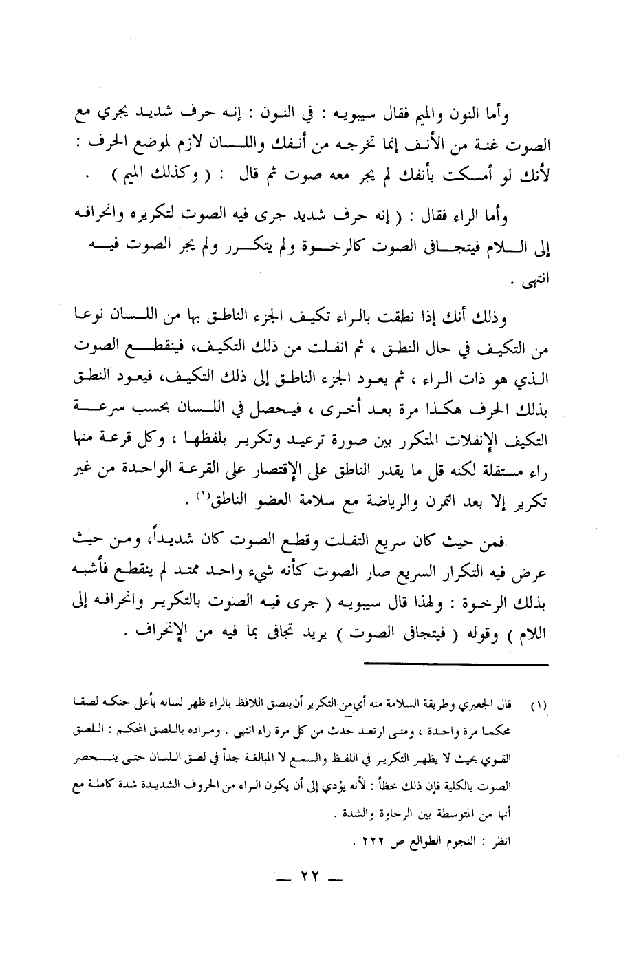 وأما الراء فقال: (إنه حرف شديد جرى فيه الصوت لتكريره وانحرافه إلى اللام فيتجافى الصوت كالرخوة ولم يتكرر ولم يجر الصوت فيه انتهى.