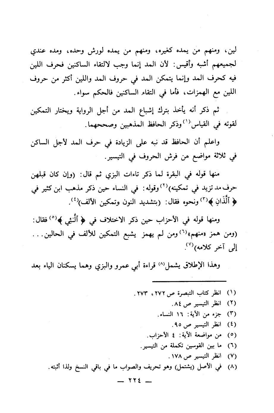 ومنها قوله في الأحزاب حين ذكر الإختلاف في {آلَّئِي} (¬5) فمّال: (ومن همز "منهم" (¬6) ومن لم يهمز يشبع التمكين للألف في الحالين ... إلى آخر كلامه (¬7).
