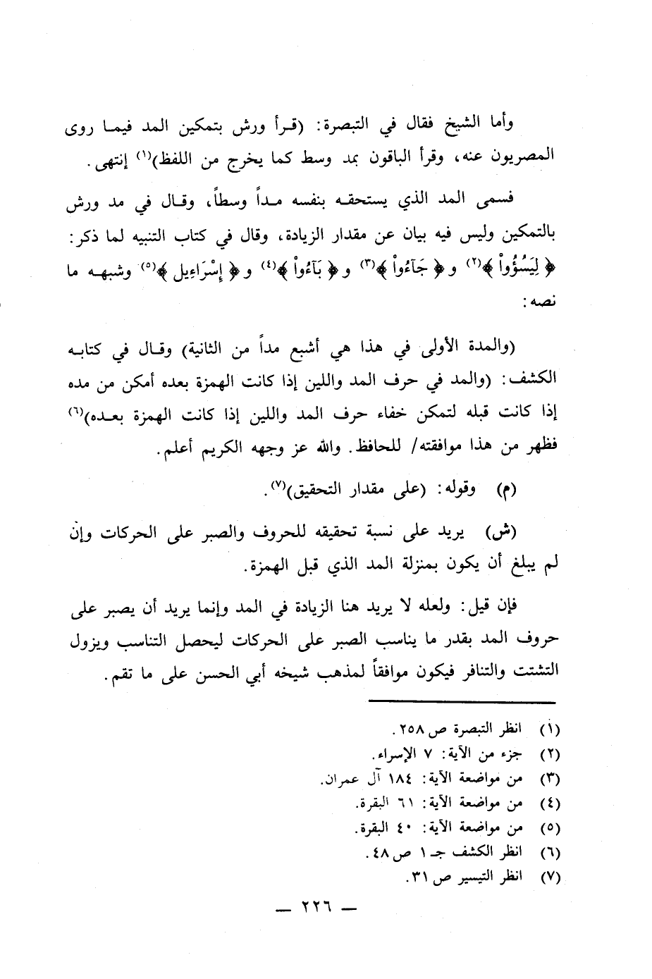 وأما الشيخ فقال في التبصرة: (قرأ ورش بتمكين المد فيما روى المصريون عنه، وقرأ الباقون بمد وسط كما يخرج من اللفظ) (¬1) انتهى.