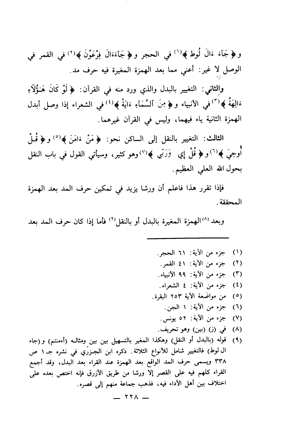 (¬9) قوله (بالبدل أو النقل) وهكذا المغير بالتسهيل بين بين ومثاله (أءمنتم) و"جاء ال لوط) فالتغيير شامل للأنواع الثلاثة. ذكره ابن الجزري في نشره جـ 1 ص 338 ويسمى حرف المد الواقع بعد الهمزة عند القراء بعد البدل، وقد أجمع القراء كلهم فيه على القصر إلا ورشا من طريق الأزرق فإنه اختص بعده على اختلاف بين أهل الأداء فيه، فذهب جماعة منهم إلى قصره.