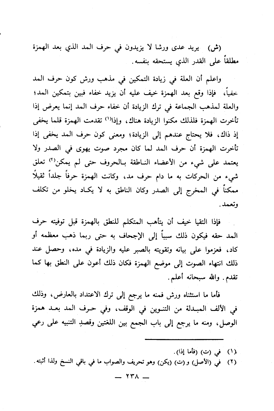 وأعلم أن العلة في زيادة التمكين في مذهب ورش كون حرف المد خفياً، فإذا وقع بعد الهمزة خيف عليه أن يزيد خفاء فبين بتمكين المد؛ والعلة لمذهب الجماعة في ترك الزيادة أن خفاء حرف المد إنما يعرض إذا تأخرت الهمزة فلذلك مكنوا الزيادة هناك، وإذا (¬1) تقدمت الهمزة قلما يخفى إذ ذاك، فلا يحتاج عندهم إلى الزيادة؛ ومعنى كون حرف المد يخفى إذا تأخرت الهمزة أن حرف المد لما كان مجرد صوت يهوى في الصدر ولا يعتمد على شيء من الأعضاء الناطقة بالحروف حتى لم يمكن (¬2) تعلق شيء من الحركات به ما دام حرف مد، وكانت الهمزة حرفاً جلدًا ثقيلَاً ممكنًا في المخرج إلى الصدر وكان الناطق به لا يكاد يخلو من تكلف وتعمد.
