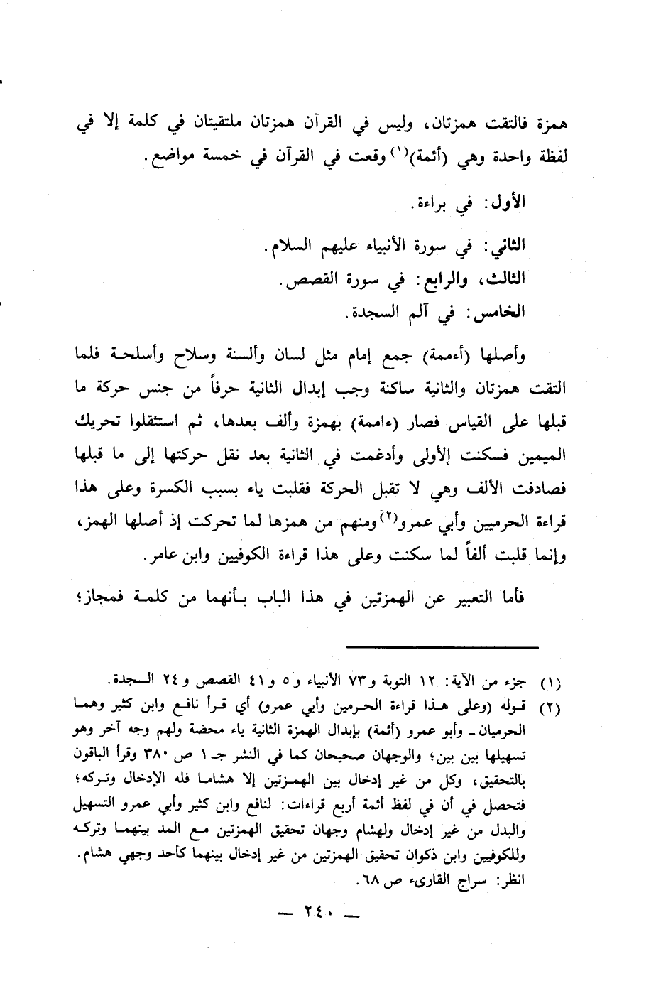 همزة فالتقت همزتان، وليس في القرآن همزتان ملتقيتان في كلمة إلا في لفظة واحدة وهي (أئمة) (¬1) وقعت في القرآن في خمسة مواضع.