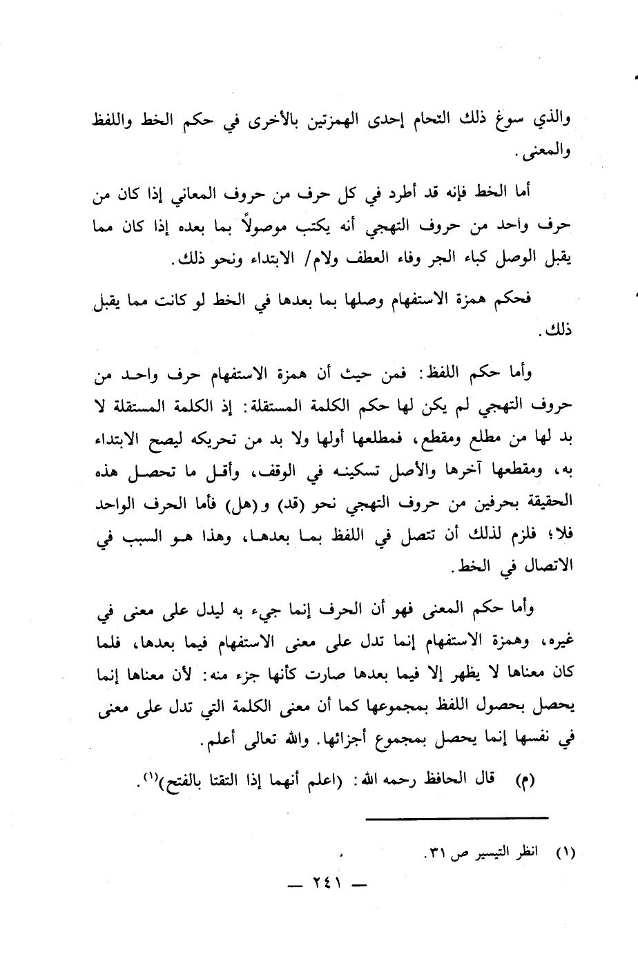 وأما حكم اللفظ: فمن حيث أن همزة الإستفهام حرف واحد من حروف التهجي لم يكن لها حكم الكلمة المستقلة: إذ الكلمة المستقلة لا بد لها من مطلع ومقطع، فمطلعها أولها ولابد من تحريكه ليصح الإبتداء به، ومقطعها آخرها والأصل تسكينه في الوقف، وأقل ما تحصل هذه الحقيقة بحرفين من حروف التهجي نحو (قد) و (5 ل) فأما الحرف الواحد فلا؛ فلزم لذلك أن تتصل في اللفظ بما بعدها، وهذا هو السبب في الإتصال في الخط.