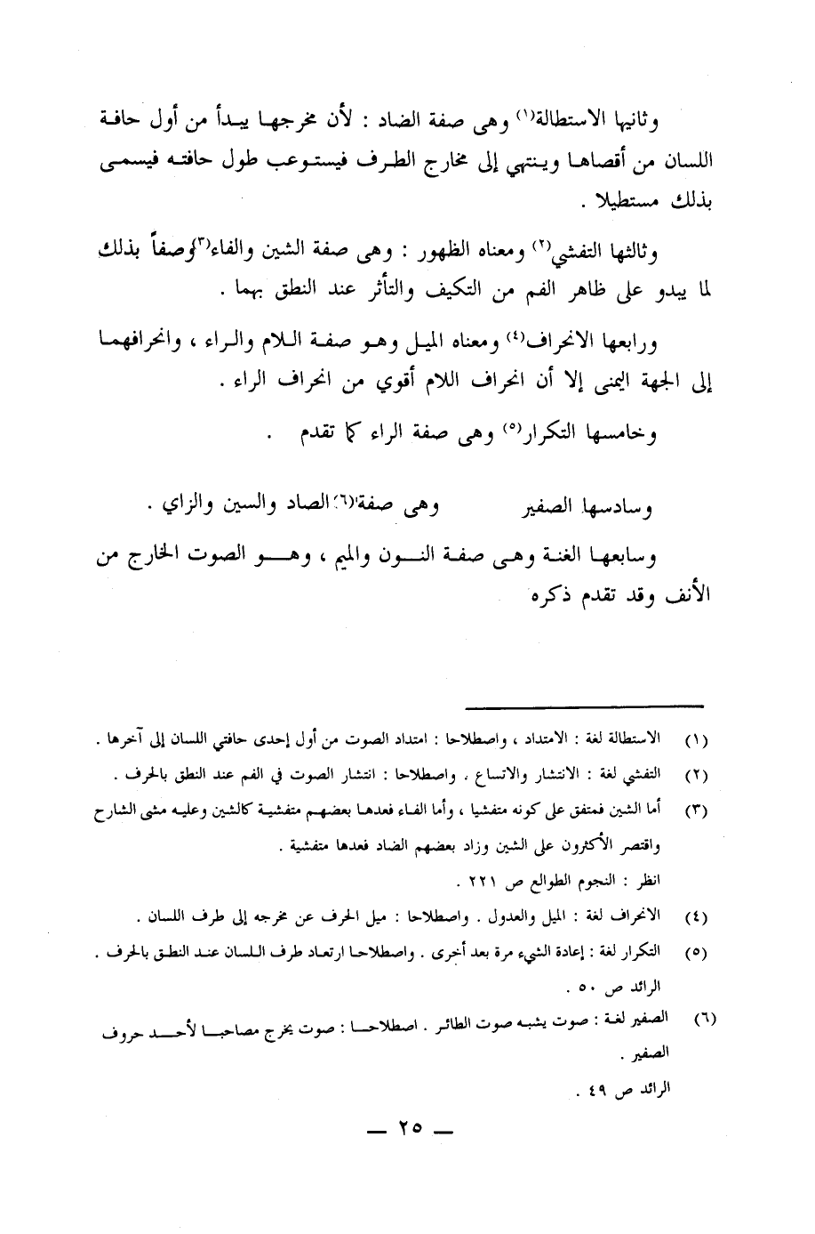 ورابعها الإنحراف (¬4) ومعناه الميل وهو صفة اللام والراء، وانحرافهما إلى الجهة افي إلا أن انحراف اللام أقوي من انحراف الراء.