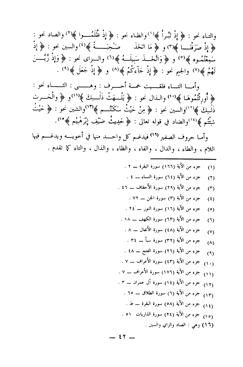 والتاء نحو: {إِذْ تَبَرَّأَ} (¬1) والظاء نخو: {إِذْ ظَلَمُوا} (¬2) والصاد نحو: {وَإِذْ صَرَفْنَا} (¬3) و {مَا اتَّخَذَ صَاحِبَةً} (¬4) والسين نحو: {إِذْ سَمِعْتُمُوهُ} (¬5) و {وَاتَّخَذَ سَبِيلَهُ} (¬6) والزاي نحو: {وَإِذْ زَيَّنَ لَهُمُ} (¬7) والجيم نحو: {إِذْ جَاءَكُمْ} (¬8) و {إِذْ جَعَلَ} (¬9).