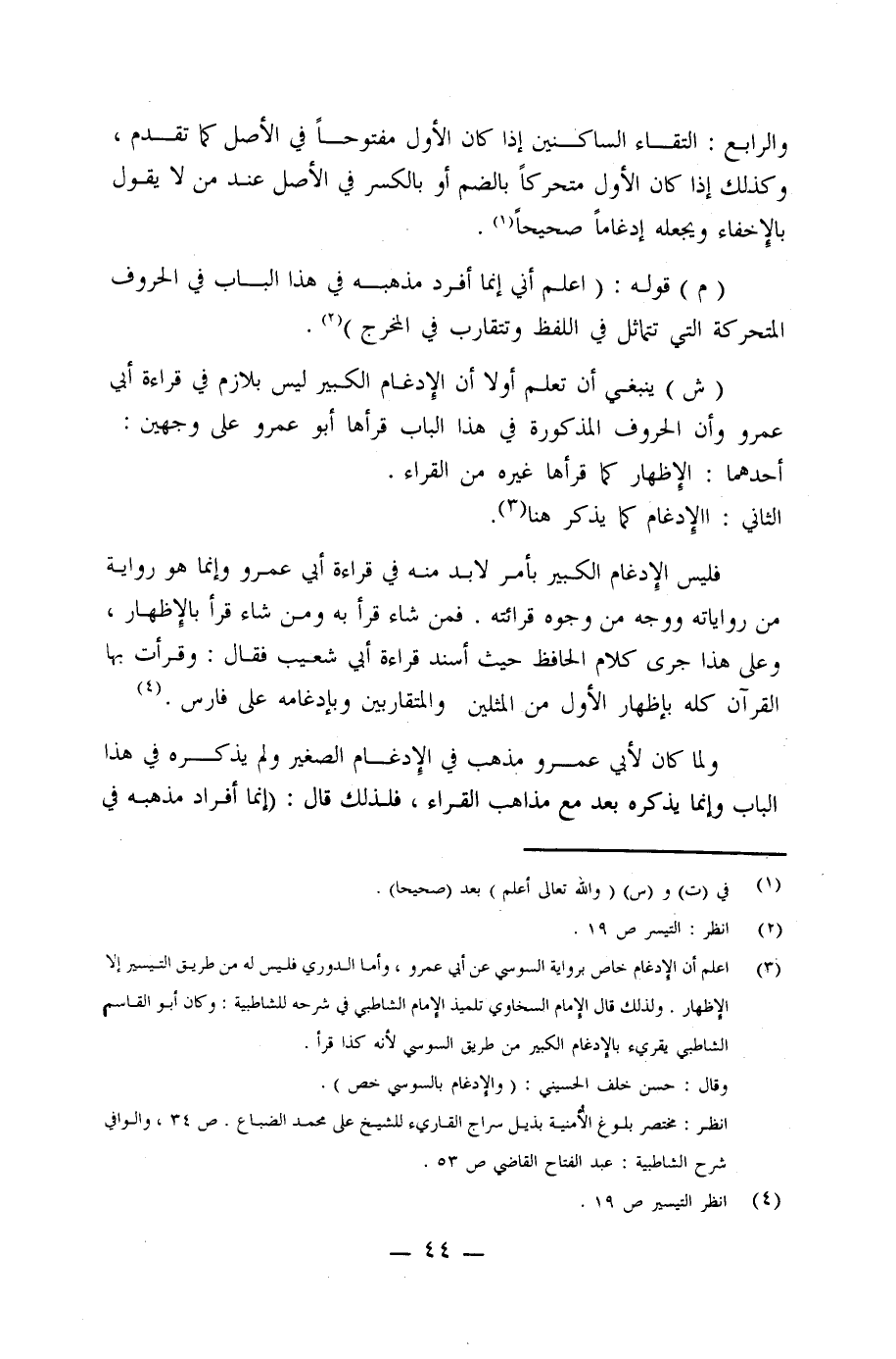 (¬3) اعلم أن الإِدغام خاص برواية السوسي عن أبي عمرو، وأما الدوري فليس له من طريق التيسير إلا الإِظهار. ولذلك قال الإِمام السخاوي تلميذ الإِمام الشاطبي في شرحه للشاطبية: وكان أبو القاسم الشاطبي يقريء بالإدغام الكبير من طريق السوسي لأنه كذا قرأ.