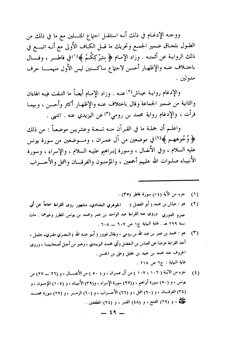(¬2) هو: عياش بن محمد (أبو الفضل) الجوهري البغدادي كما مشهور روى القراءة سماعاً عن أبي عمرو الدورى وروى عنه القراءة عبد الواحد بن عمر ومحمد بن يونس المطرز وغيرهما. مات سنة 299 هـ. غاية النهاية ج 1 ص 607 - 608.