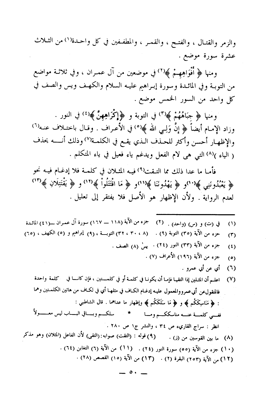 (¬7) اعلم أن المثلين إذا التقيا فإما أنه يكونا في كلمة أو في كلمتين، فإن كانا في كلمة واحدة فالمقول عن أبو عمرو والمحمول عليه إدغام الكاف في مثلها أي في لكاف من هاتين الكلمتين وهما: {مَنَاسِكَكُمْ} و {مَا سَلَكَكُمْ} وإظهار ما عداهما. قال الشاطبي: