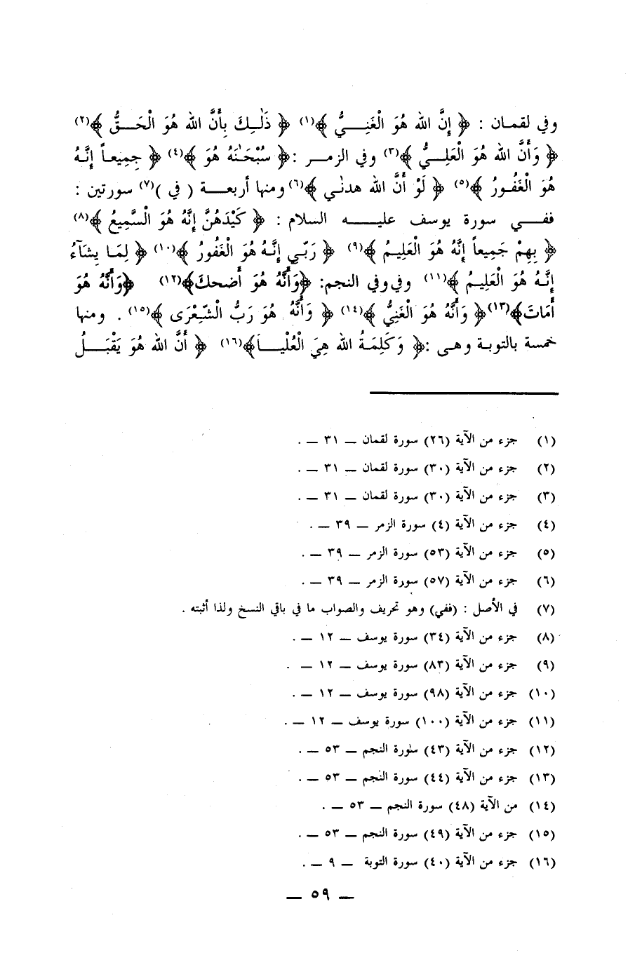 وفي لقمان: {إنَّ الله هُوَ الْغَنِيَ} (¬1) {ذَلِكَ بِأنَّ الله هُوَ الْحَقُّ} (¬2) {وَأنً اللَة هُوَ الْعَلِيَ} (¬3) وفي الزمر: {سُبْحَنَهُ هُوَ} (¬4) {جِمِيعاً إِنَّهُ هُؤ الْغَفُورُ} (¬5) {لَوْ أَنَّ اللَّهَ هَدَانِي} (¬6) ومنها أربعة (في) (¬7) سورتين: ففي سورة يوسف - عليه السلام -: {كَيْدَهُنَ إِنَّهُ هُوَ الْسممِيعُ} (¬8) {بِهِمْ جَمِيعًا إِنَّهُ هُوَ الْعَلِيمُ} (¬9) {رَبِّي إِنَّهُ هُوَ الْغَفُور} (¬10) {لِمَا يَشَاءُ إِنَّهُ هُوَ الْعَلِيمُ} (¬11) وفي النجم: {وَأَنَّهُ هُوَ أَضْحَكَ} (¬12) {وَأَنَّهُ هُوَ أَمَاتَ} (¬13) {وَأَنَّهُ هُوَ الْغَنِيُّ} (¬14) {وَأَنَّهُ هُوَ رَبُّ الشِّعْرَى} (¬15). ومنا خمسة بالتوبة وهي: {وَكَلِمَةُ الله هِيَ الْعُلْيَا} (¬16) {أَنَّ الله هُوَ يَقْبَلُ