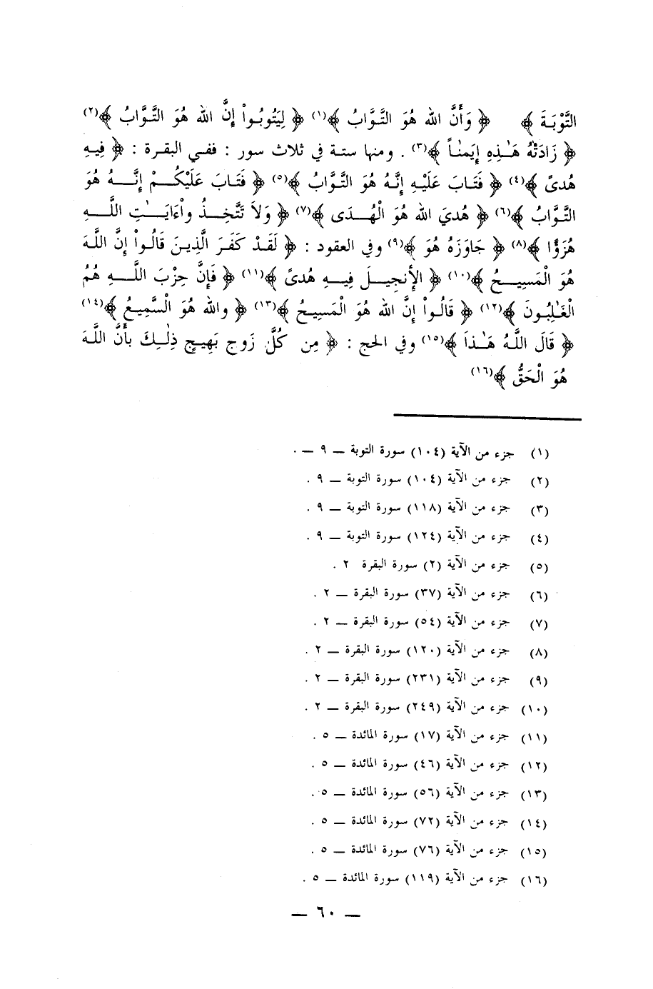 التَّوْبَةَ} {إِنَّ اللَّهَ هُوَ التَّوَّابُ} (¬1) {لِيَتُوبُواْ انَ اللَة هُوَ التَّوَّابُ} (¬2) {زَادَتْهُ هَذِهِ إِيمَانًا} (¬3). ومنها ستة في ثلاث سور: ففي البقرة: {فِيهِ هُدىً} (¬4) {فَتَابَ عَلَيْهِ إِنَّهُ هُوَ التَّوَّابُ} (¬5) {فَتَابَ عَلَيْكُمْ إِنَّهُ هُوَ التَّوَّابُ} (¬6) {هُدَى اللَّهِ هُوَ الْهُدَى} (¬7) {وَلاَ تَتَّخِذُواْءَايَتِ اللهِ هُزَوا} (¬8) {جَاوَزَهُ هُوَ} (¬9) وفي العقود: {لَقَدْ كَفَرَ الَّذِينَ قَالُواْ إِنَّ اللهَ هُوَ الْمَسِيحُ} (¬10) {الْإِنْجِيلَ فِيهِ هُدًى} (¬11) {فَإنَّ حِزْبَ الله هُمُ الْغَلِبُونَ} (¬12) {قَالُوا إِنَّ اللَّهَ هُوَ الْمَسِيحُ} (¬13) {وَاللَّهُ هُوَ السَّمِيعُ} (¬14) {قَالَ اللَّهُ هَذَا} (¬15) وفي الحج: {مِنْ كُلِّ زَوْجٍ بَهِيجٍ ذَلِكَ بِأَنَّ اللَّهَ هُوَ الْحَقّ} (¬16)