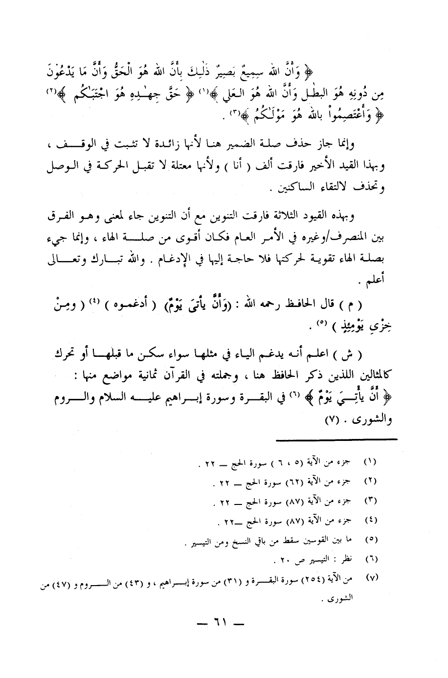 (ش) اعلم أنه يدغم الياء في مثلها سواء سكن ما قبلها أو تحرك كالمثالين اللذين ذكر الحافظ هنا، وحملته في القرآن ثمانية مواضع منها: {أَنَّ يأْتِيَ يَوْمٌ} (¬6) في البقرة وسورة إبراهيم - عليه السلام - والروم والشورى. (¬7)