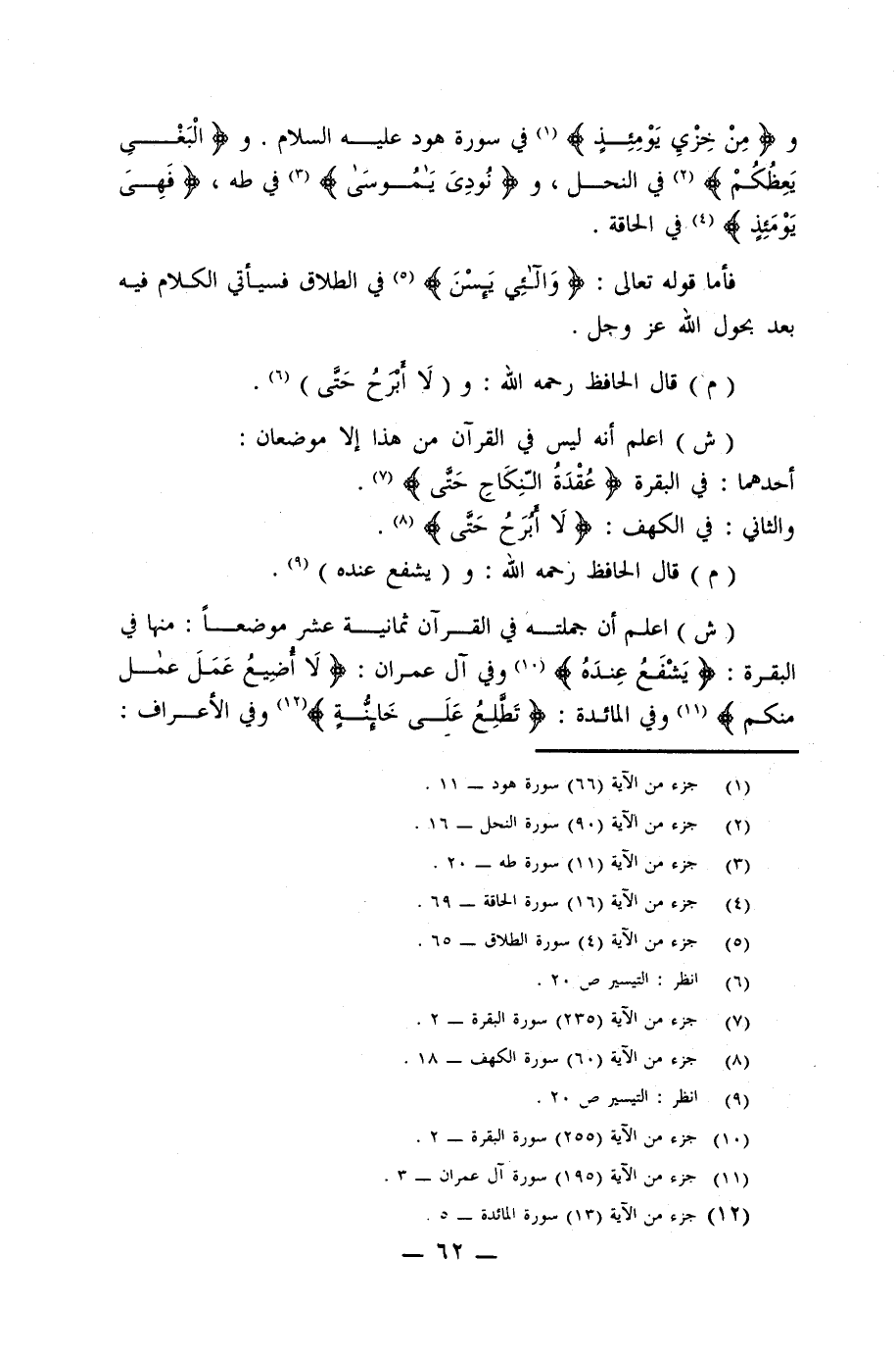 (ش) اعلم أن جملته في القرآن ثمانية عشر موضعاً: منها في البقرة: {يَشثفَعُ عِندَهُ} (¬10) وفي آل عمران: {لَا أُضِيعُ عَمَلَ عَامِلٍ مِنْكُمْ} (¬11) وفي المائدة: {تَطلِعُ عَلَى خَائِنُّةٍ} (¬12) وفي الأعراف:
