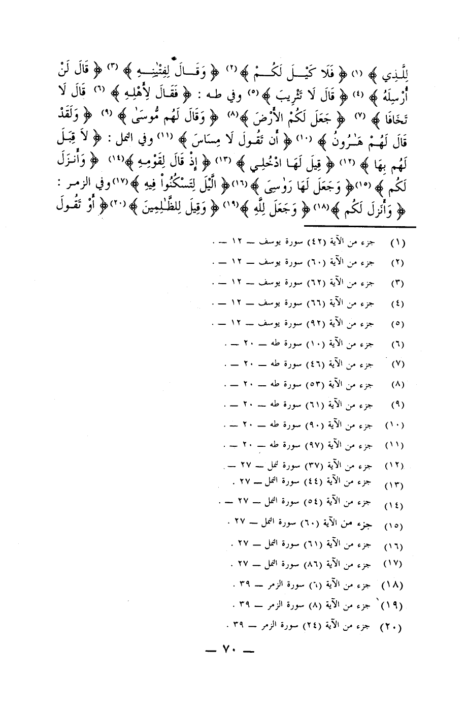 لِلَّذِي} (¬1) {فَلَا كَيْلَ لَكُمْ} (¬2) {وَقَالَ لِفِتْيَانِهِ} (¬3) {قَالَ لَنْ أَرْسِلَهُ} (¬4) {قَالَ لَا تَثْرِيبَ} (¬5) وفي طه: {فَقَالَ لِأَهْلِهِ} (¬6) {قَالَ لَا تَخَافَا} (¬7) {جَعَلَ لَكُمْ الْأَرْضَ} (¬8) {وَقَالَ لَهُم مُّوسَى} (¬9) {وَلَقَدْ قَالَ لَهُمْ هَارُونُ} (¬10) {أَنْ تَقُولَ لَا مِسَاسَ} (¬11) وفي النمل: {لَا قِبَلَ لَهُم بِهَا} (¬12) {قِيلَ لَهَا ادْخُلِي} (¬13) {إِذْ قَالَ لِقَوْمِهِ} (¬14) {وَأَنْزَلَ لَكُمْ} (¬15) {وَجَعَلَ لَهَا رَوسِىَ} (¬16) {الْلَّيْلَ لِتَسْكُنُواْ فِيهِ} (¬17) وفي الزمر: {وَأَنْزَلَ لَكُمْ} (¬18) {وَجَعَلَ لِلَّهِ} (¬19) {وَقِيلَ لِلْظَّالِمِينَ} (¬20) {أَوْ تَقُولَ