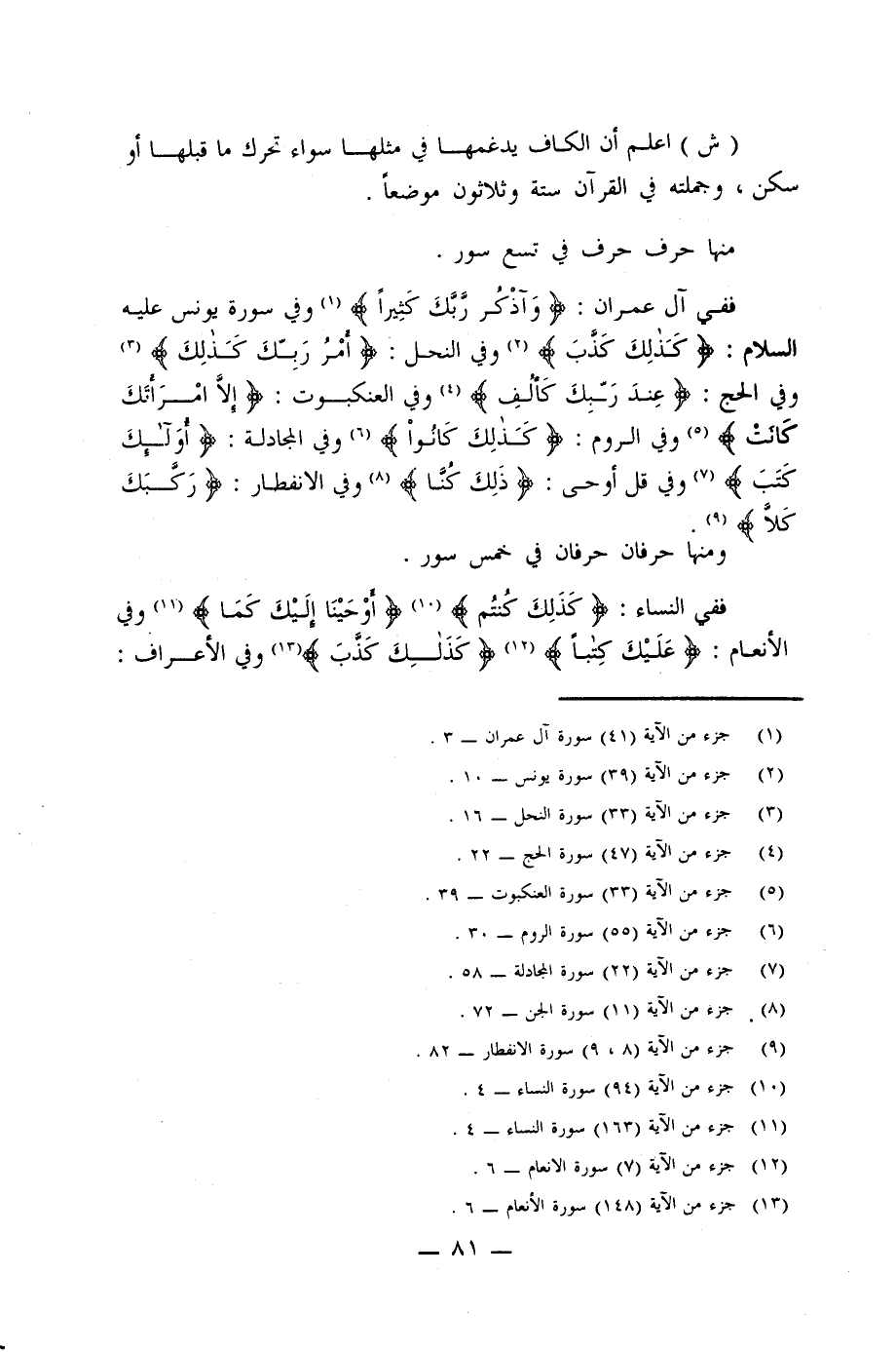 (ش) اعلم أن الكاف يدغمها في مثلها سواء تحرك ما قبلها أو سكن، وجملته في القرآن ستة وثلاثون موضعًا.