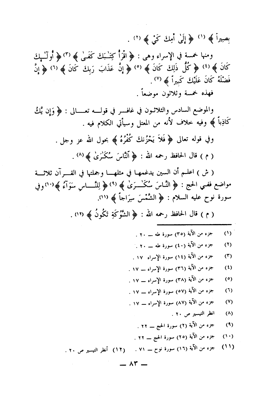 (ش) اعلم أن السين يدغمها في مثلها وجملتها في القرآن ثلاثة مواضع ففي الحج: {النَّاسَ سُكَارَى} (¬9) {لِلنَّاسِ سَوَاءُ} (¬10) وفي سورة نوح - عليه السلام -: (الشَّمْسَ سِرَاجًا} (¬11).