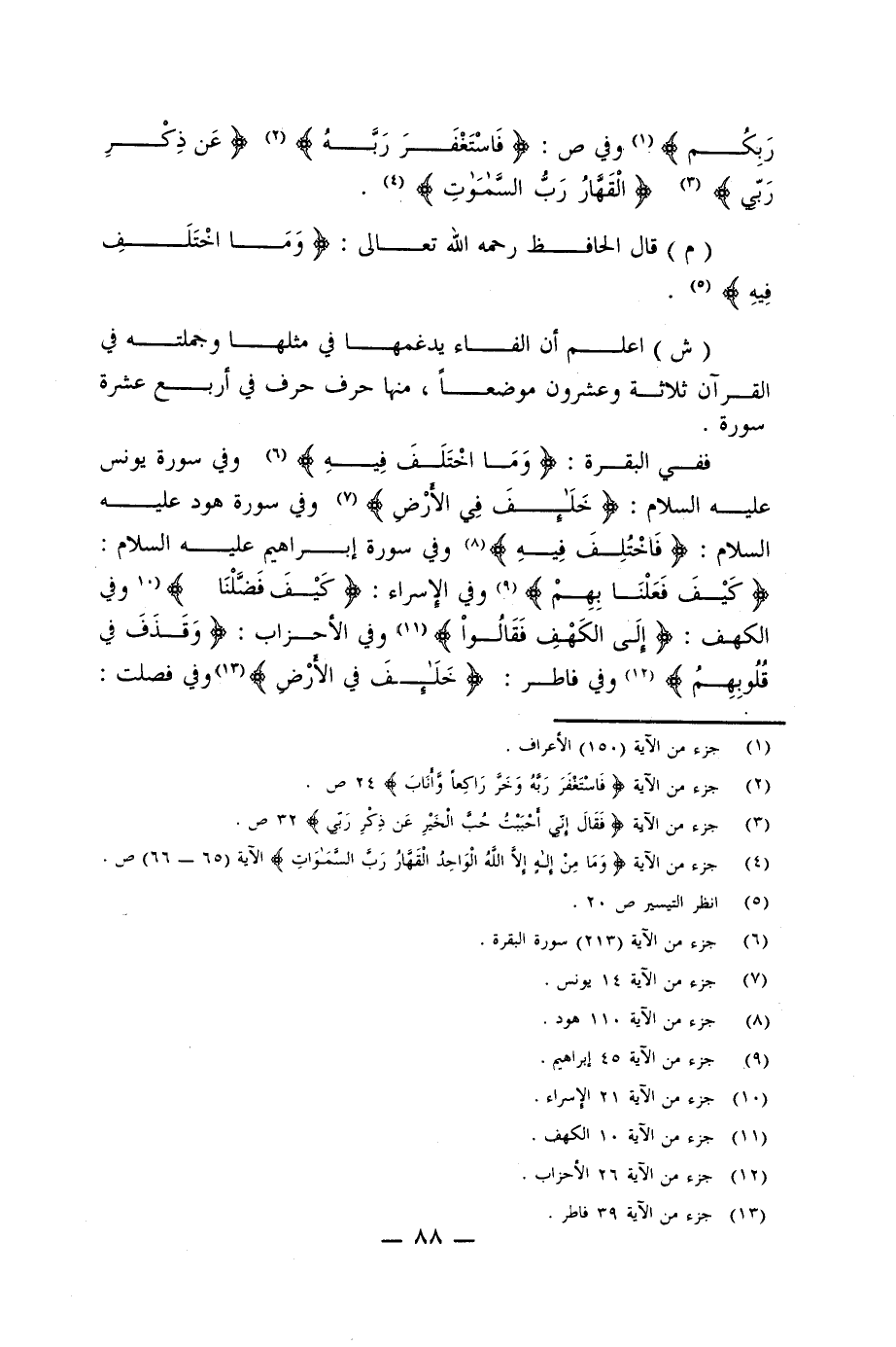 ففي البقرة: {وَمَا اخْتَلَفَ فِيهِ} (¬6) وفي سورة يونس - عليه السلام -: {خَلَائِفَ فِي الْأَرْضِ} (¬7) وفي سورة هود عليه السلام: {فَاخْتُلِفَ فِيهِ} (¬8) وفي سورة إبراهيم - عليه السلام -: {كَيْفَ فَعَلْنَا بِهِمْ} (¬9) وفي الإسراء: {كَيْفَ فَضَّلْنَا} (¬10) وفي الكهف: {إِلَى الْكَهْفِ فَقَالُواْ} (¬11) وفي الأحزاب: {وَقَذَفَ فِي قُلُوبِهِمُ} (¬12) وفي فاطر: {خَلَائِفَ فِي الْأَرْضِ} (¬13) وفي فصلت: