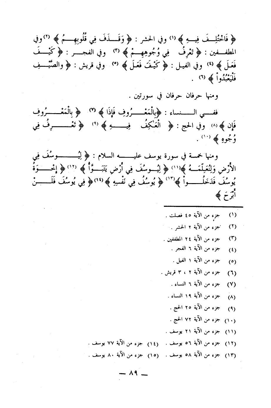 {فَاخْتُلِفَ فِيهِ} (¬1) وفي الحشر: {وَقَذَفَ فِي قُلُوبِهِمُ} (¬2) وفي المطففين: {تَعْرِفُ فِي وُجُوهِهِمْ} (¬3) وفي الفجر: {كَيْفَ فَعَلَ} (¬4) وفي الفيل: {كَيْفَ فَعَلَ} (¬5) وفي قريش: {والْصَّيْفِ فَلْيَعْبُدُواْ} (¬6).